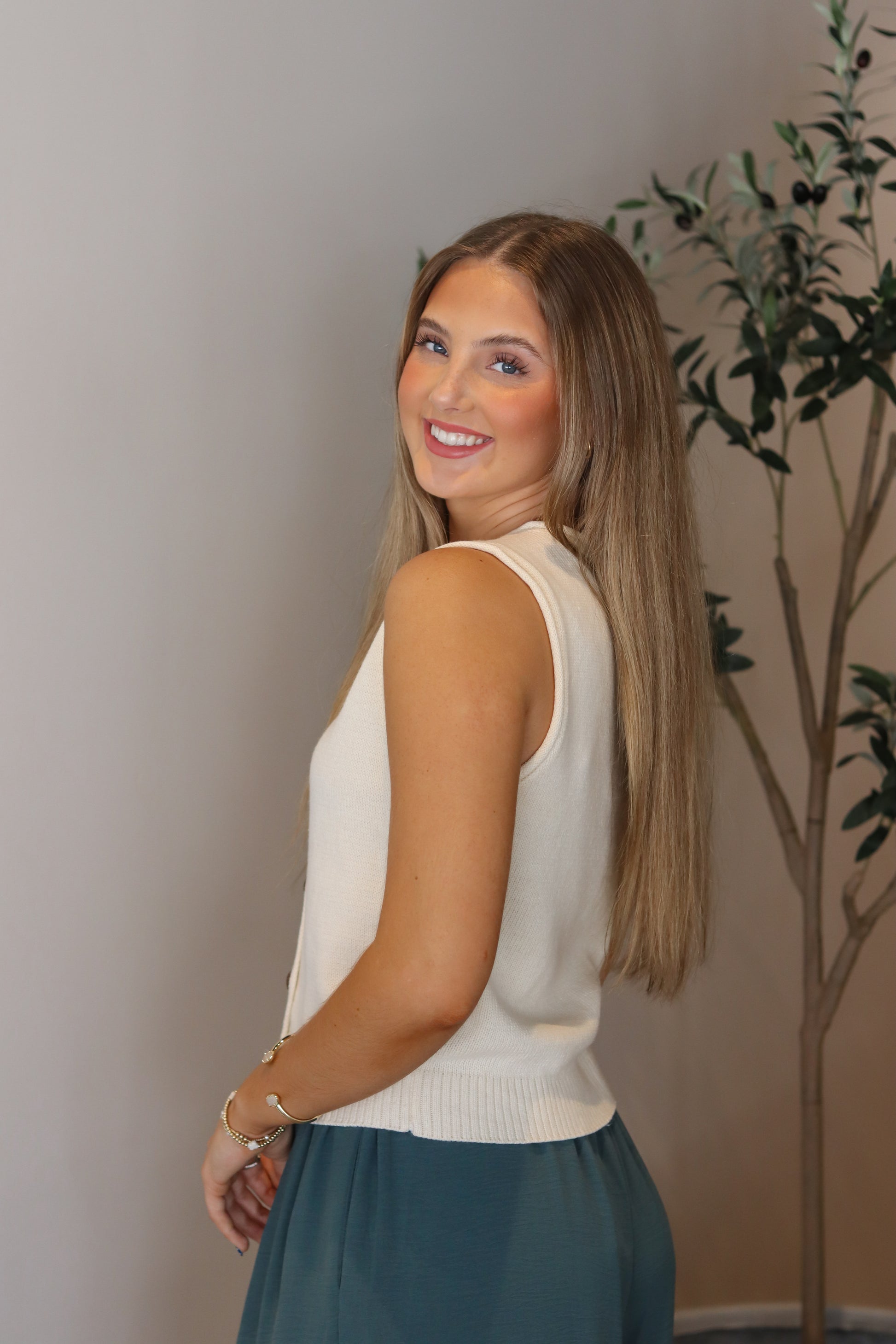 Add a touch of timeless charm with the Autumn Prep Knit Vest. This cream, button-up tank-style vest is perfect for layering or wearing solo, offering a cozy yet polished look that transitions effortlessly from season to season.