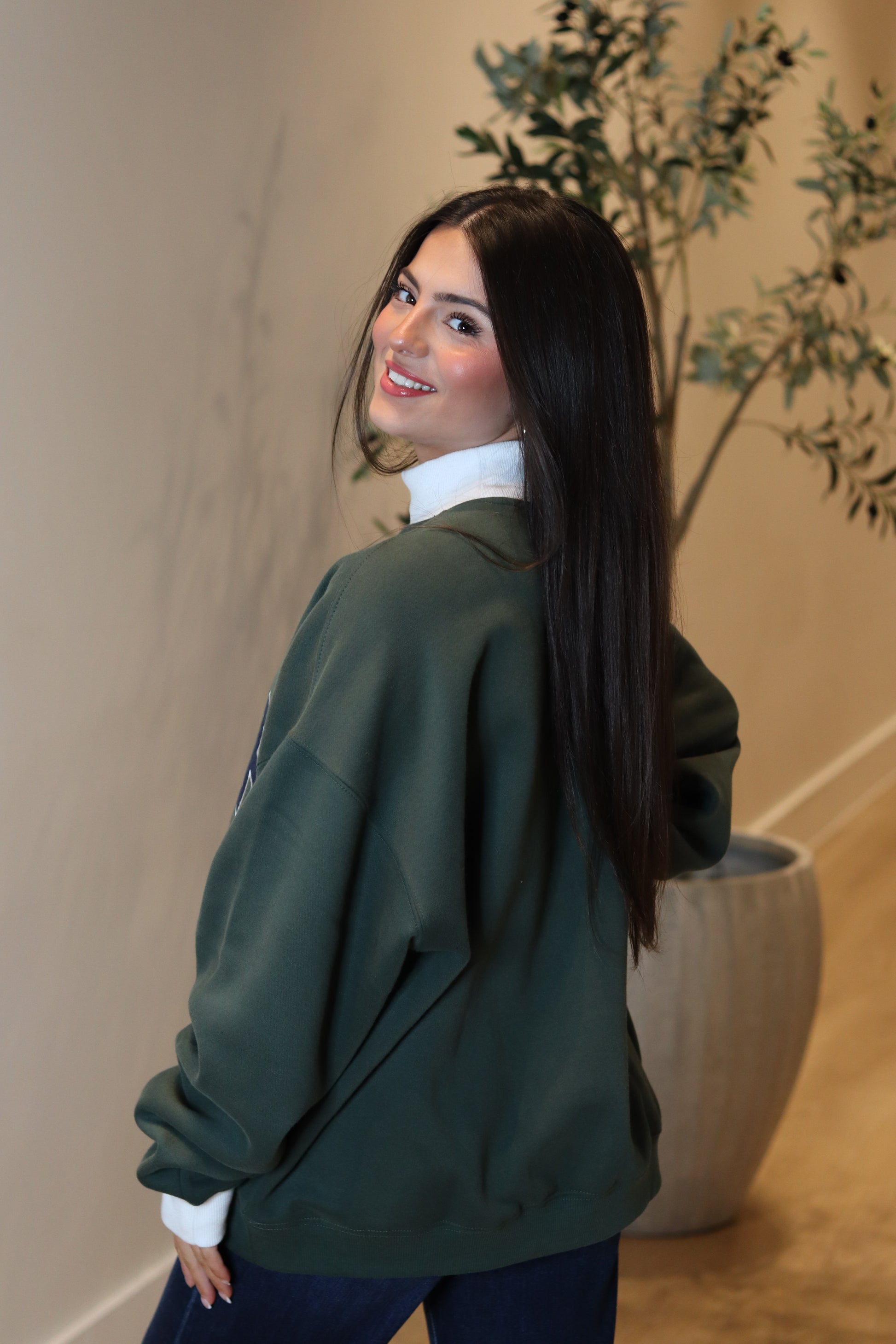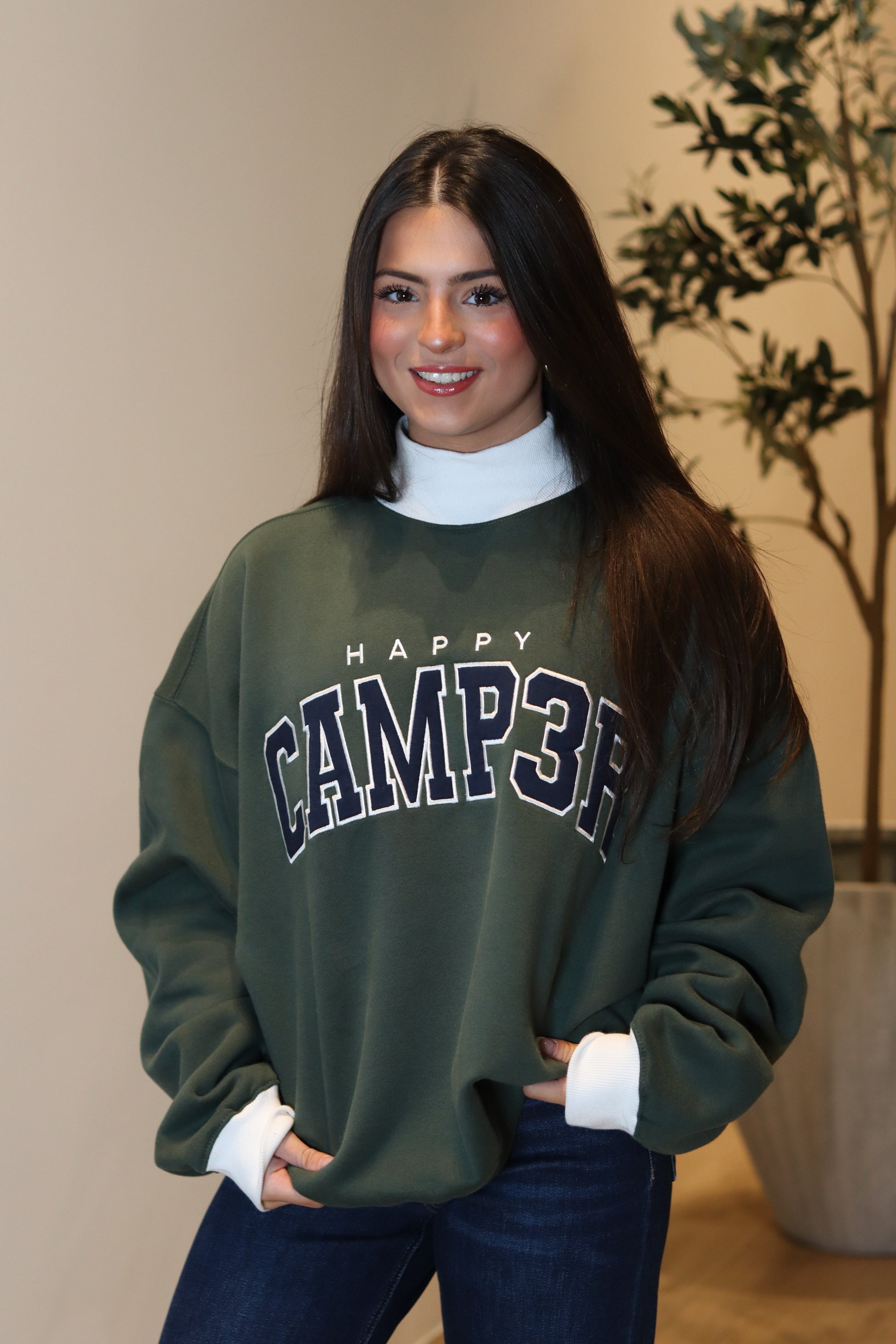 The Happy Camper Mock Neck is the definition of cozy-cool. Featuring an olive body with a soft cream mock neck and navy embroidered “Happy Camper” on the front, it’s perfect for crisp mornings and laid-back days. Comfortable, warm, and full of charm—this is your new go-to for effortless cozy style.