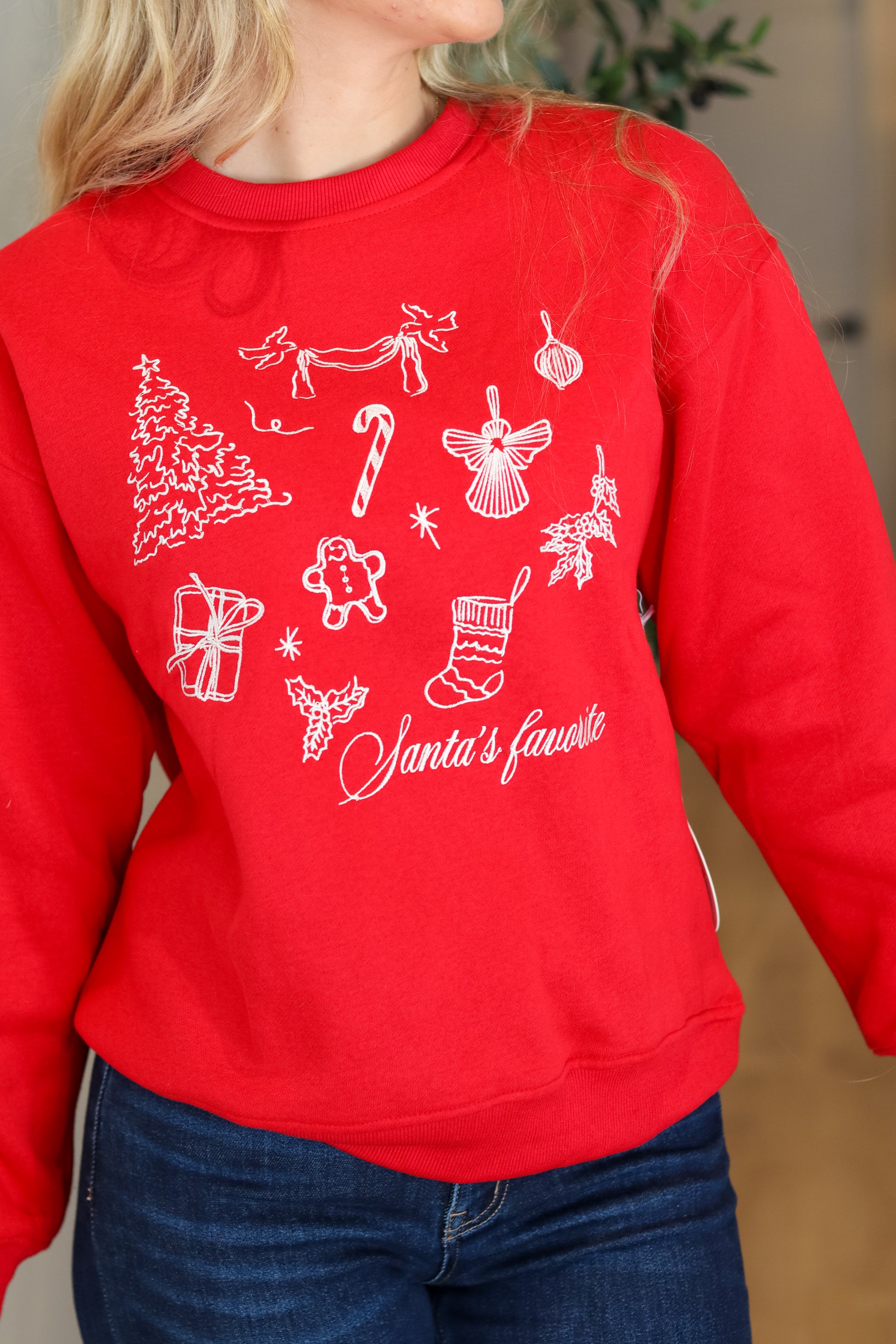 Show off your festive flair with the Christmas Spirit Embroidered Crewneck, a merry-red classic adorned with charming holiday graphics and the playful phrase Santa’s Favorite. Cozy, soft, and full of seasonal cheer, this sweatshirt is perfect for cookie baking, gift shopping, or curling up by the tree. It’s the ultimate cozy piece for anyone proudly embracing their Christmas spirit.