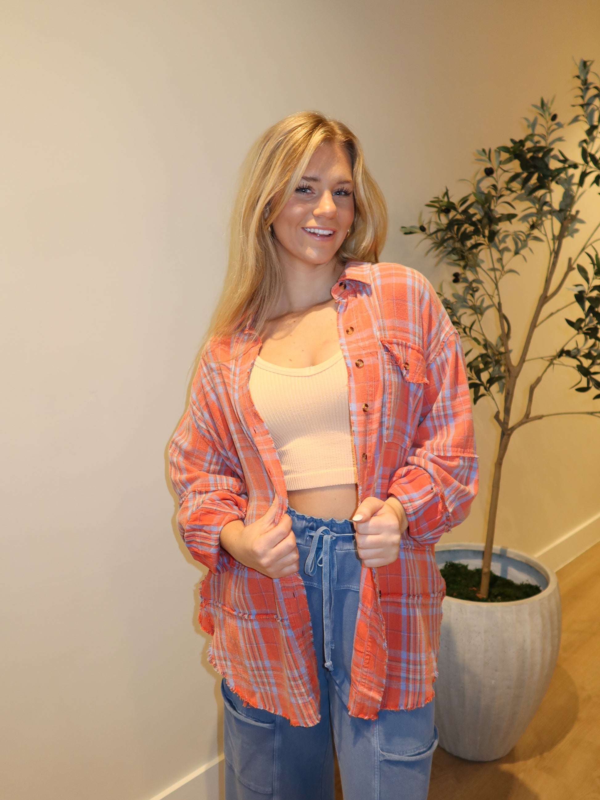 The Cover Me Up Button Down is a cozy flannel-style top in a coral and blue plaid. With its classic button-down design and soft feel, it’s perfect for layering or wearing on its own for an easy, laid-back look.