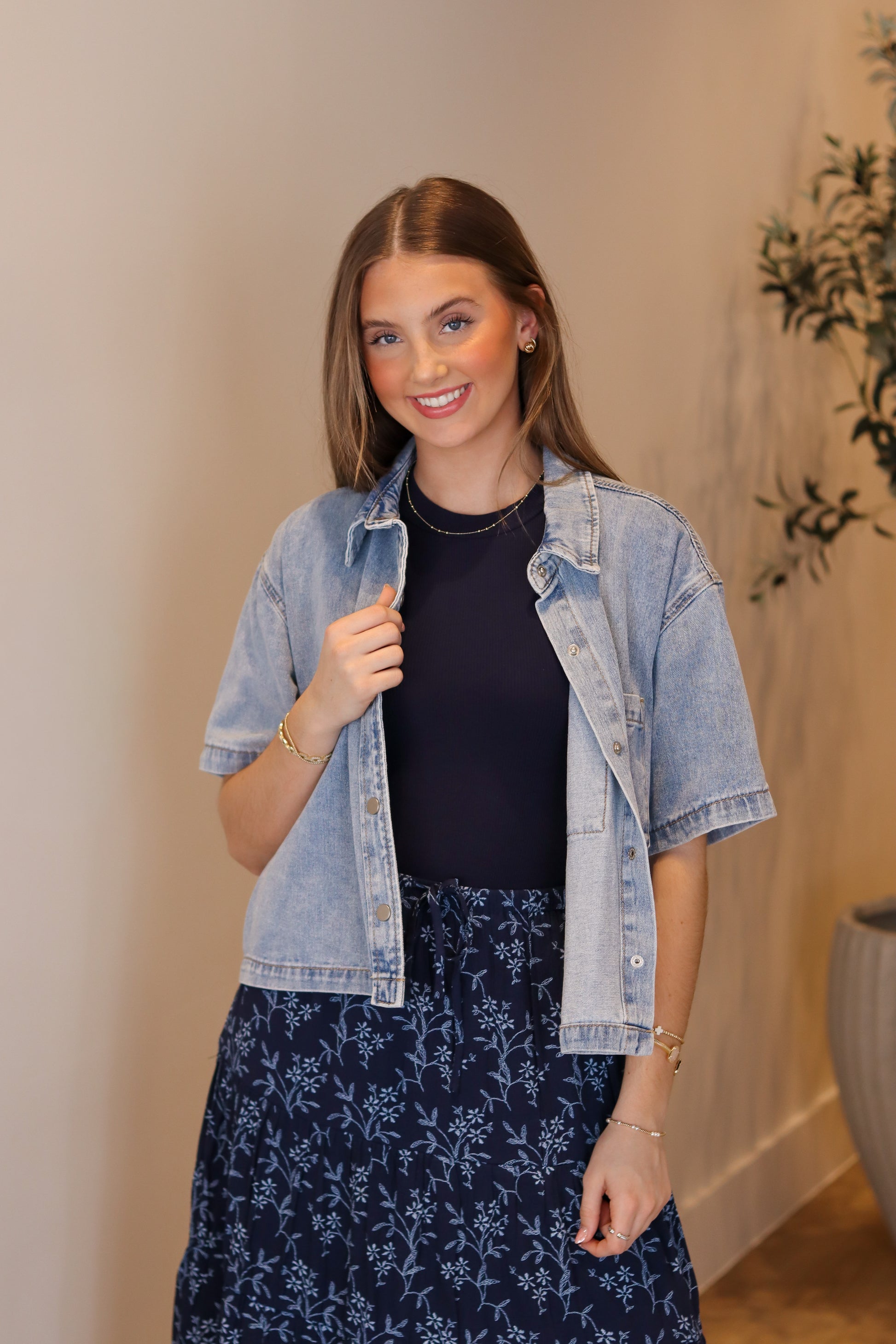 The Day Out Denim Button Up in light denim is a versatile wardrobe staple. With short sleeves and a relaxed fit, it can be worn buttoned up as a classic shirt or styled open over another top for an easy layered look.
