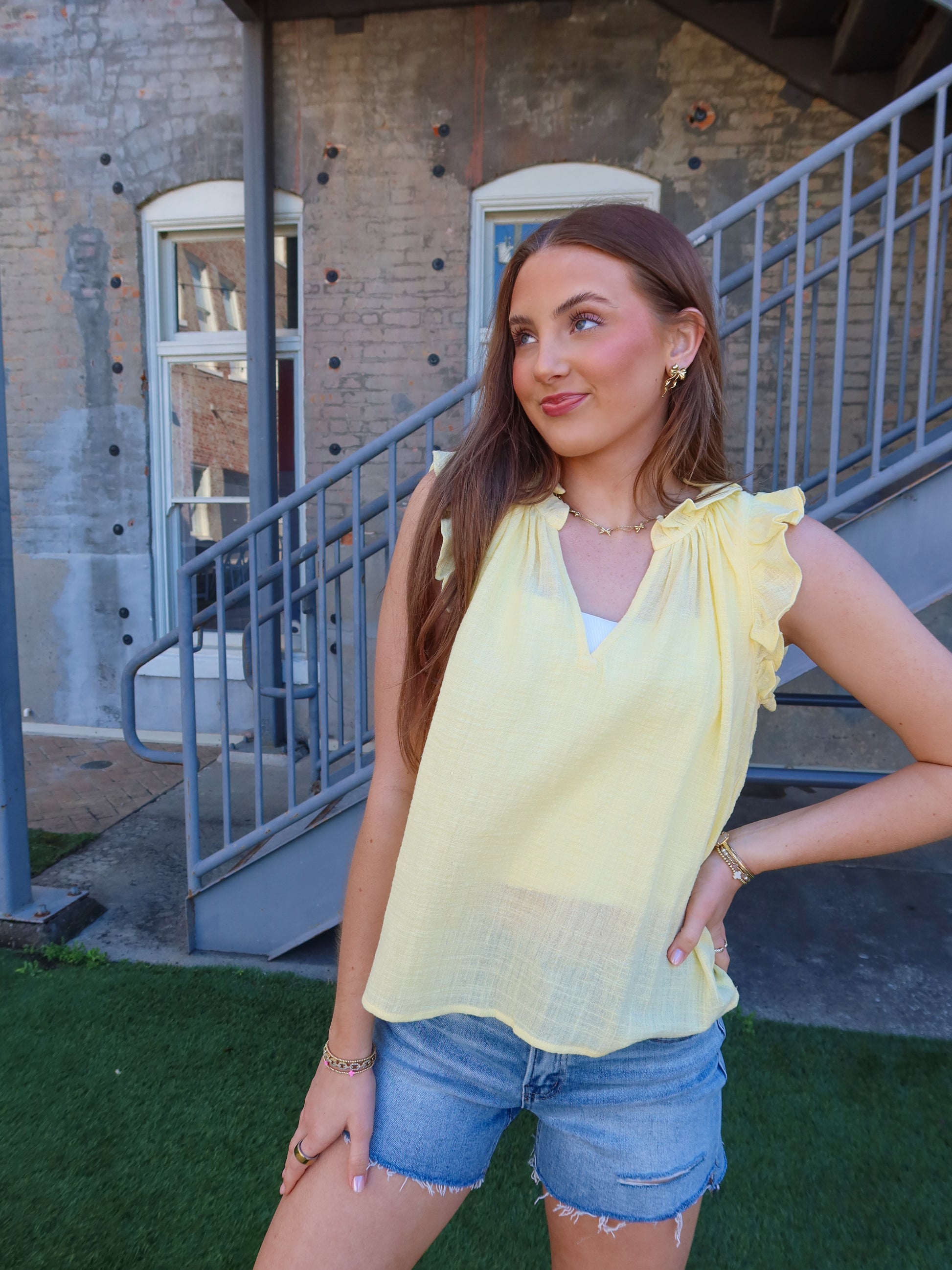 The Dockside Top is the perfect sunny staple for Spring Break days by the water. In a soft butter yellow hue with playful ruffle details and a breezy sleeveless design, this top brings a light and cheerful touch to any outfit. Easy to style with denim shorts or flowy skirts, it’s made for warm afternoons, seaside strolls, and soaking up the sunshine.