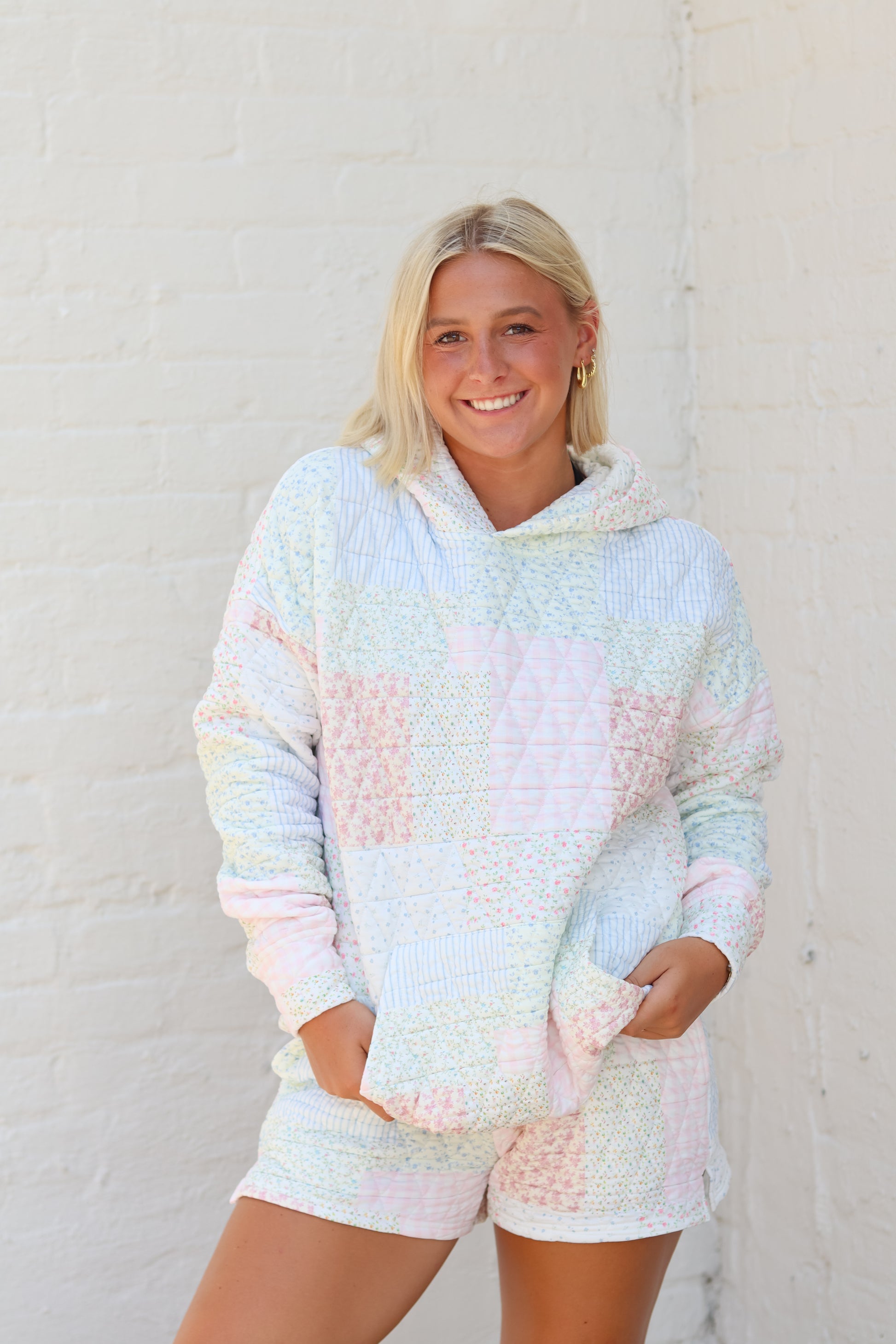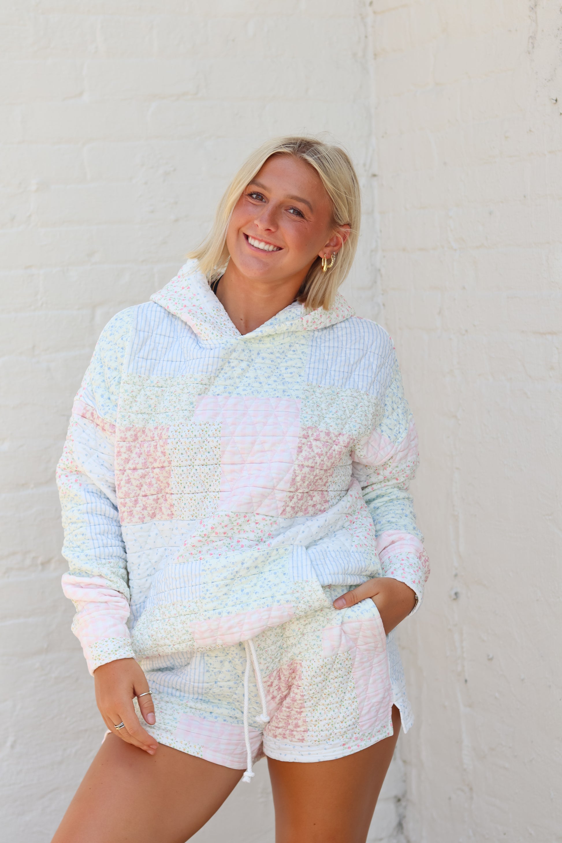 Cozy up in color with the Sunkissed Quilted Hoodie. Featuring a soft pastel multicolor design and comfy quilted texture, it’s the perfect blend of style and chill. Pair it with the matching Sunkissed Quilted Shorts for the cutest coordinated set.
