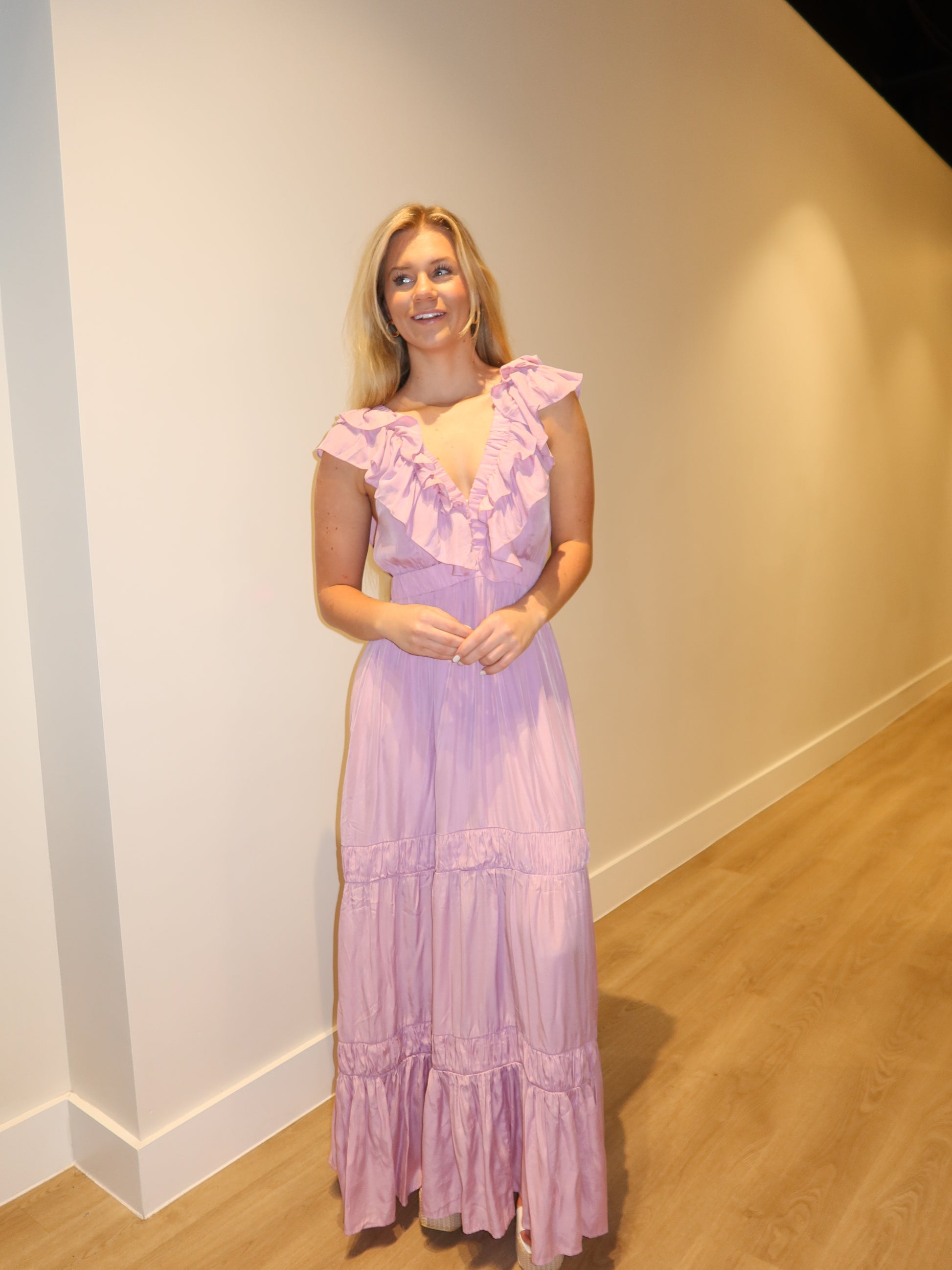 The Falling for You Maxi Dress is a romantic lilac rose piece with a flowy silhouette. Designed with a v-neckline trimmed in soft ruffles that brush the shoulders and a stretchy waist for a flattering fit, it’s the perfect dress for both effortless days and special occasions.