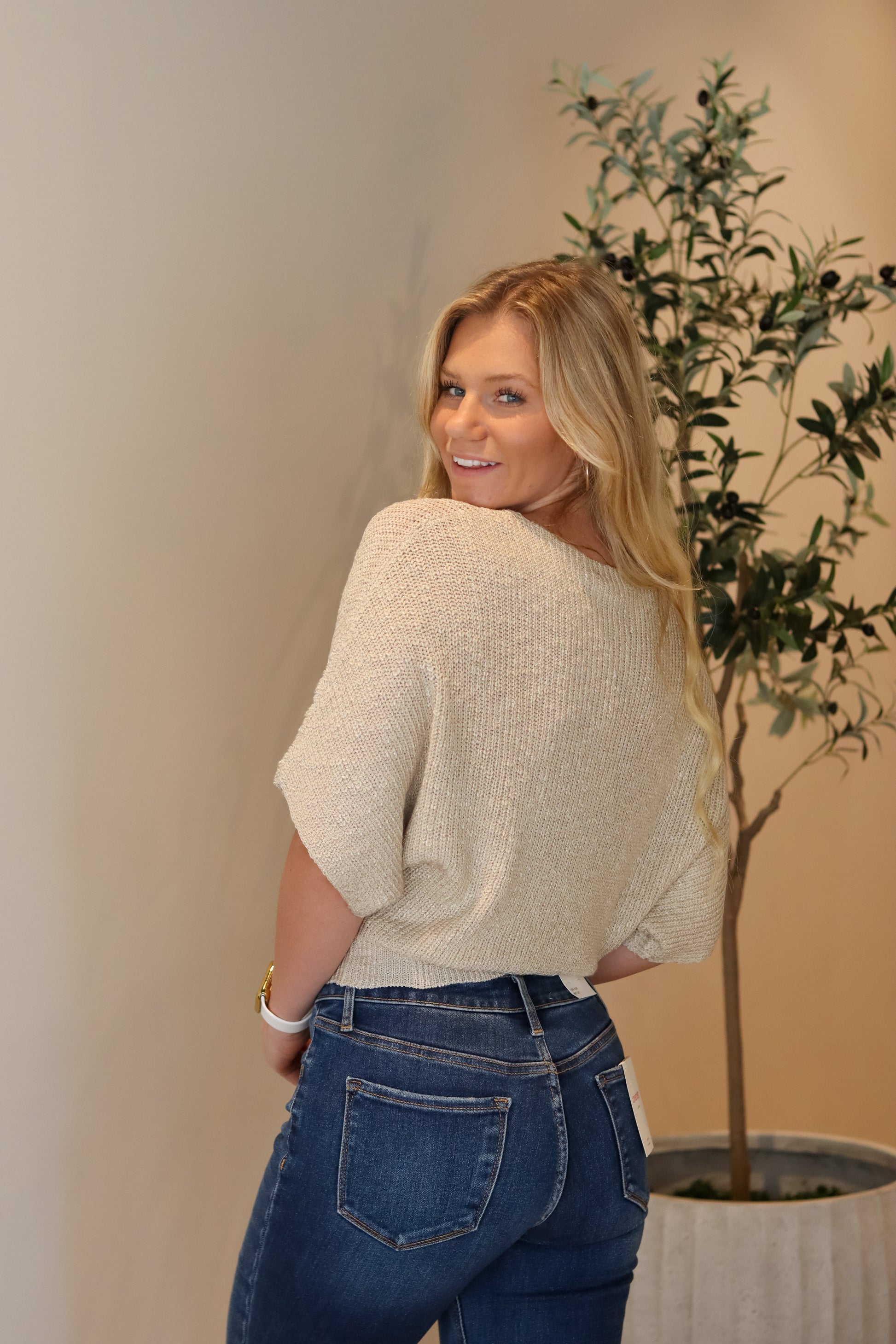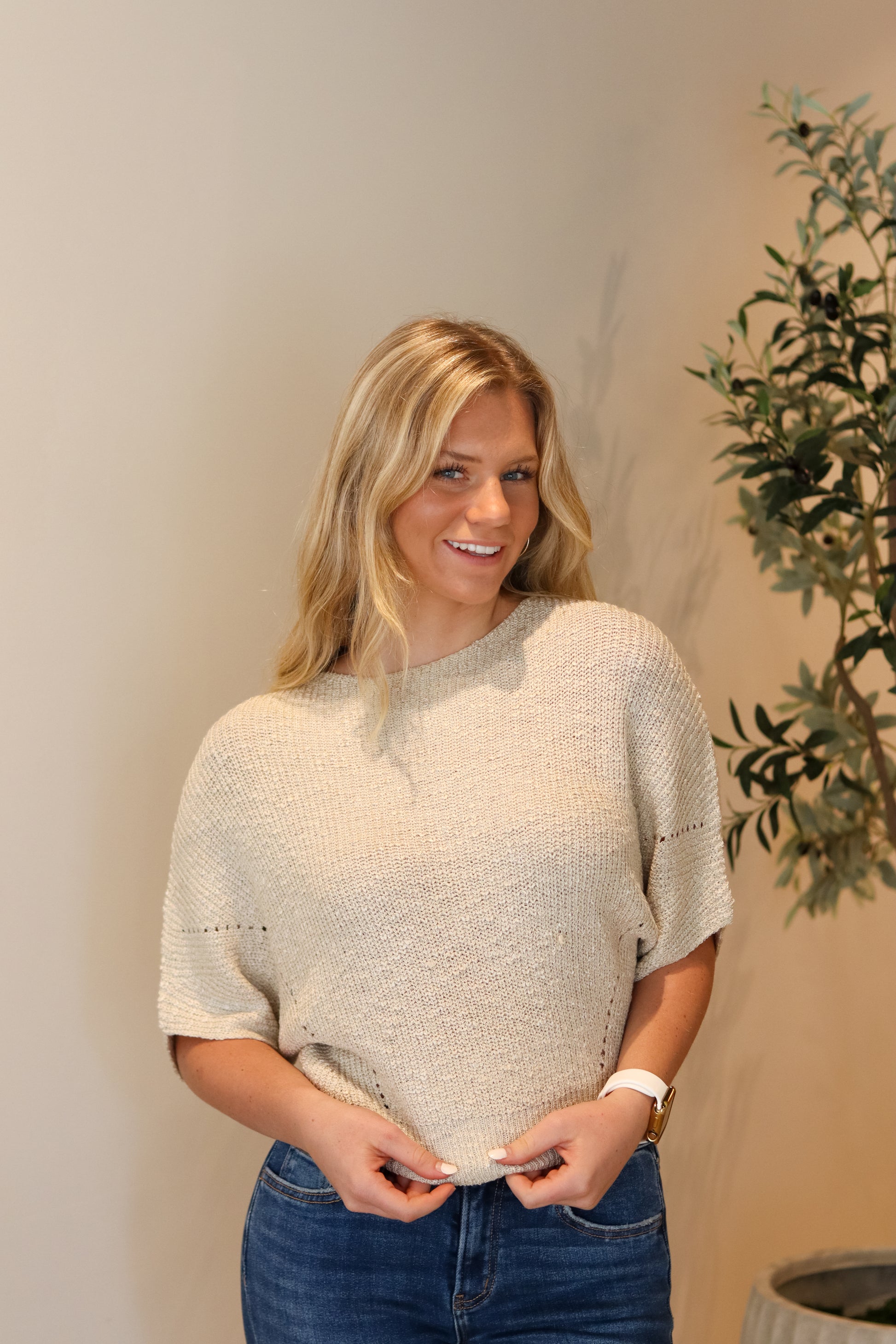 The First Chill Top is the perfect pick for crisp fall days. Crafted from cozy knit sweater material in a soft oatmeal hue, it’s made for layering and lounging as the temperatures start to drop.