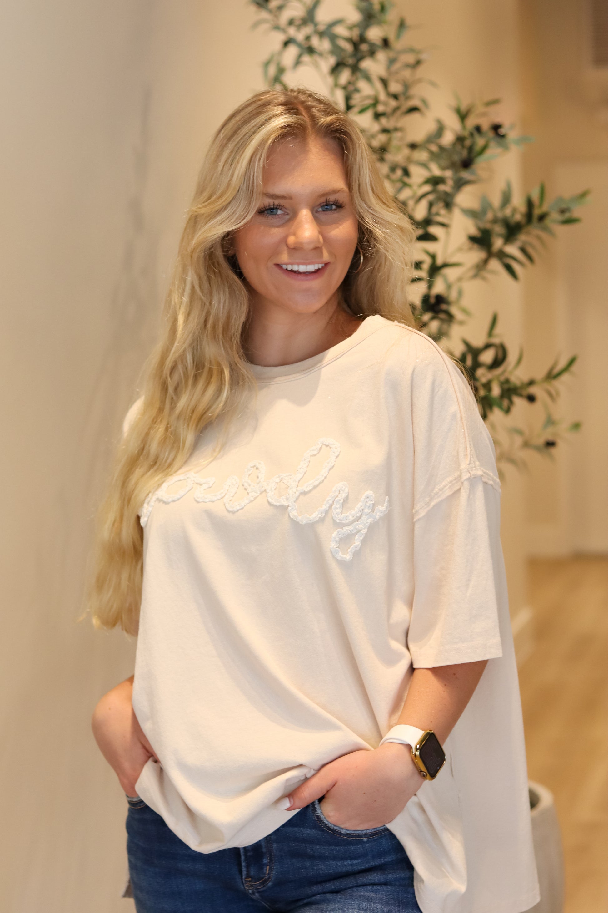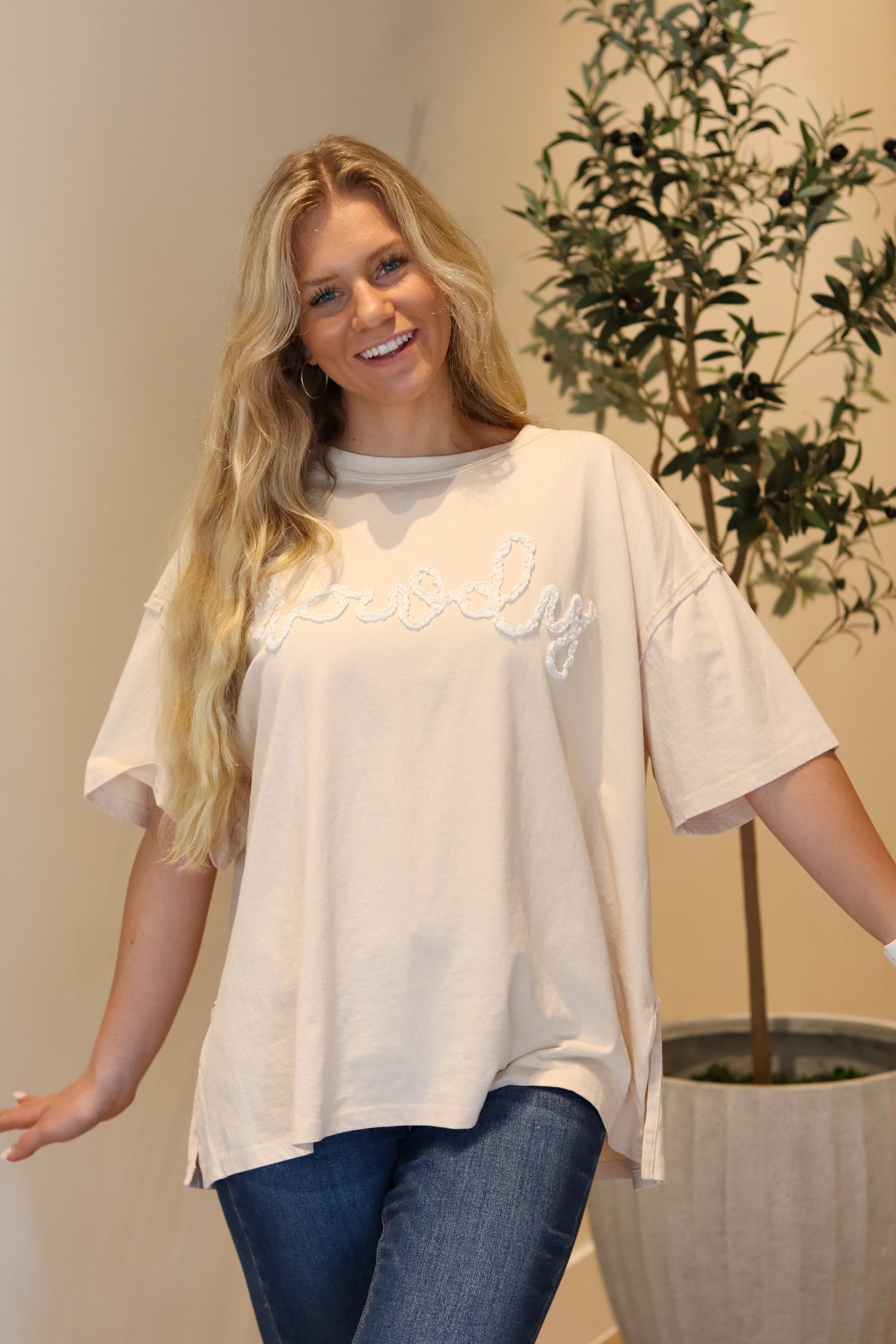 Say hello to your new favorite tee! The Howdy Tee features cream fabric with white braided lettering spelling out “Howdy” across the front. Designed with an oversized fit for that effortlessly relaxed, Western-inspired look — perfect for pairing with denim or layering year-round.