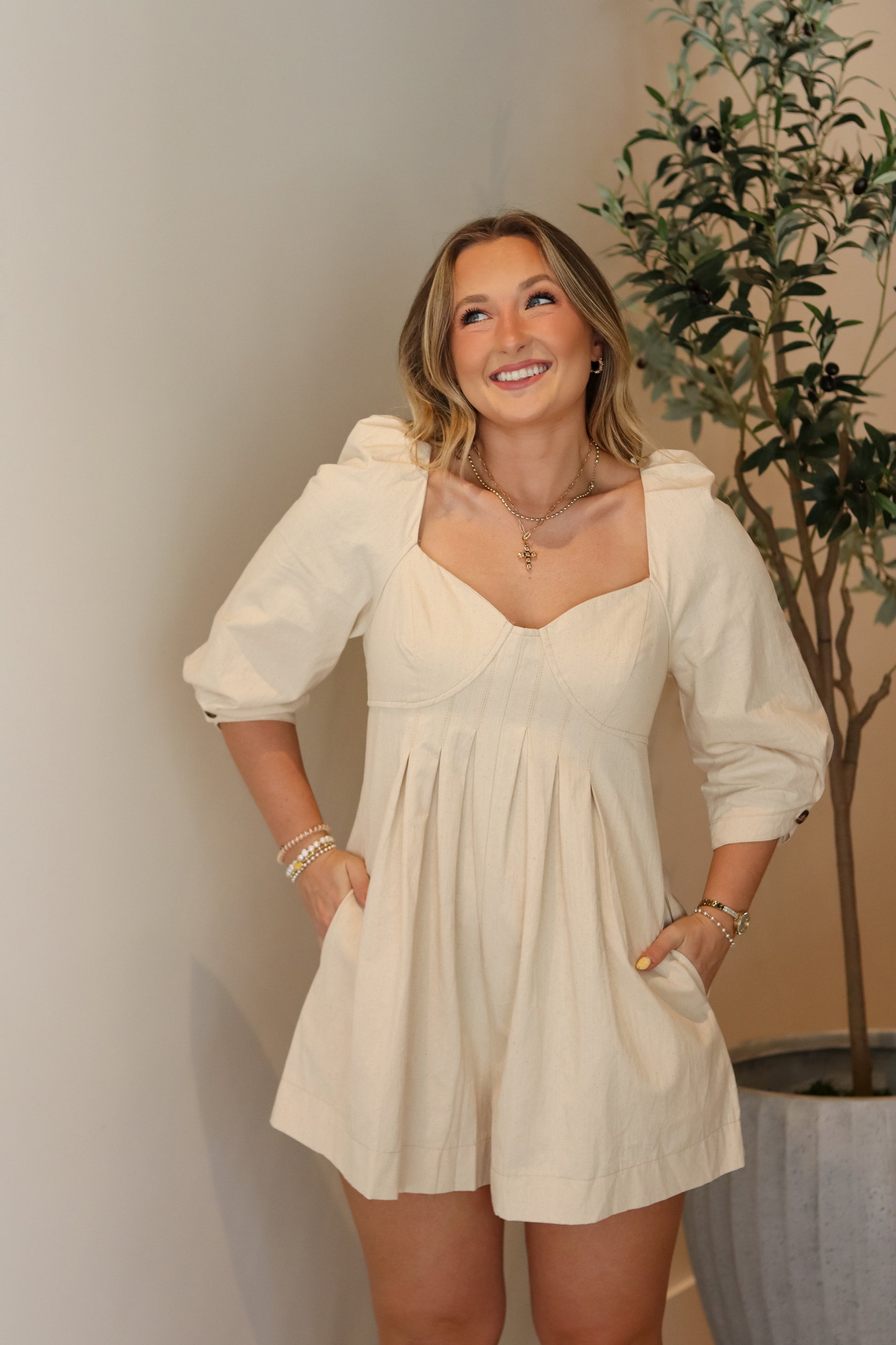 The Kara Romper is fall perfection in a soft oatmeal hue. Featuring a sweetheart neckline, puffed quarter sleeves, and a flattering fit, it’s the ideal blend of cozy and chic for pumpkin patch days or autumn evenings out.