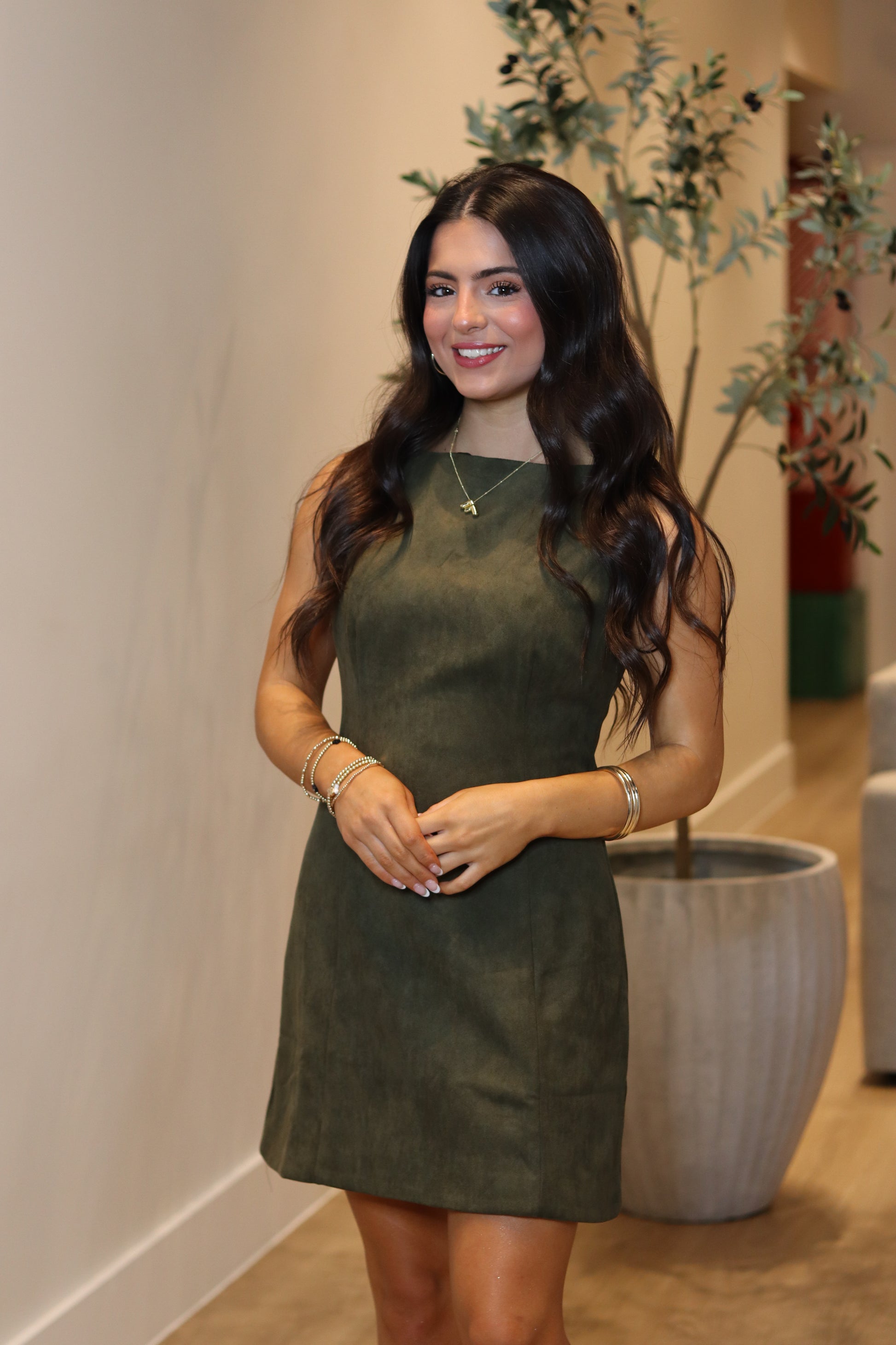 Make a statement this season in the Louisa Velvet Mini Dress. Crafted in luxe olive velvet, this sleeveless, high-neck silhouette features a sleek A-line design made for holiday nights and festive celebrations. Elegant yet playful, it’s the perfect piece for ringing in the season in style.