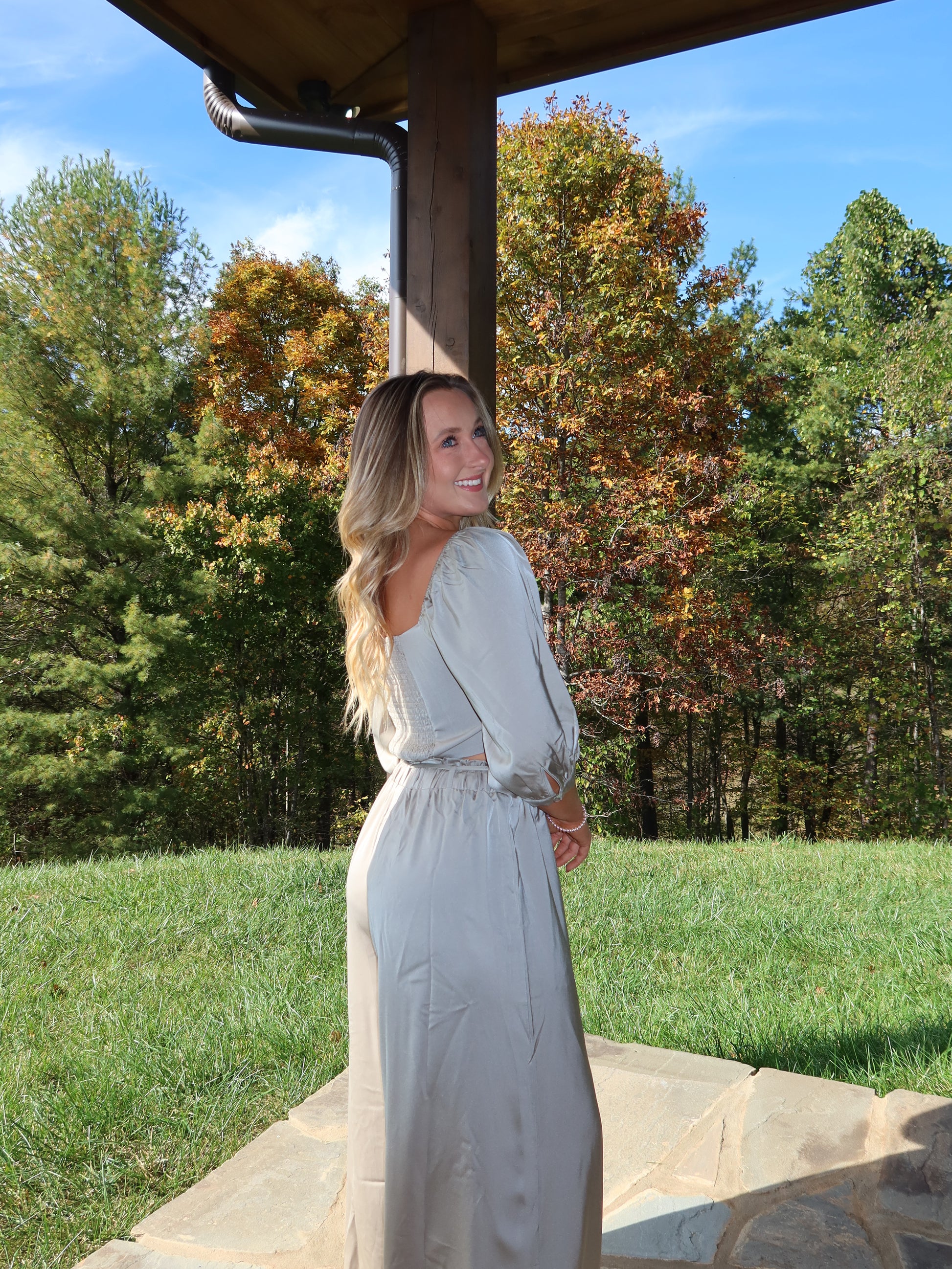 The Mavis Tie Front Top is the perfect blend of cozy and chic for fall. In a rich olive hue, this silky long-sleeve top features a flattering tie-front detail that adds a touch of effortless charm. Pair it with the matching Mavis Wide Leg Pants for a polished autumn ensemble that transitions beautifully from day to night.