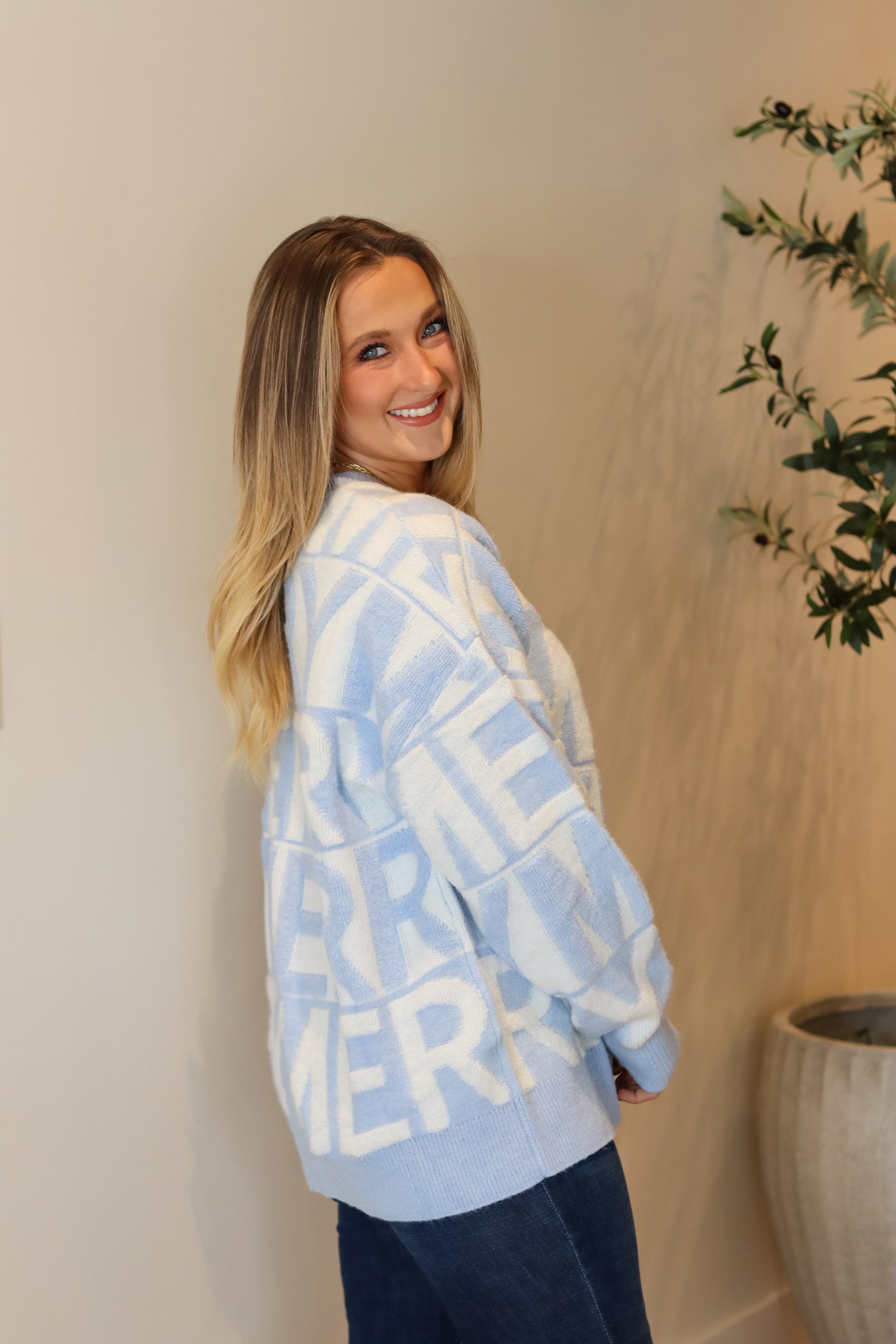 Celebrate the season in soft, snowy style with the Merry Merry Sweater. This cozy dusty blue and white knit features “merry” playfully repeated throughout, creating a cheerful pattern that feels equal parts festive and chic. Whether you're trimming the tree, wrapping gifts, or heading to a holiday get-together, this sweater brings effortless Christmas spirit to every moment.