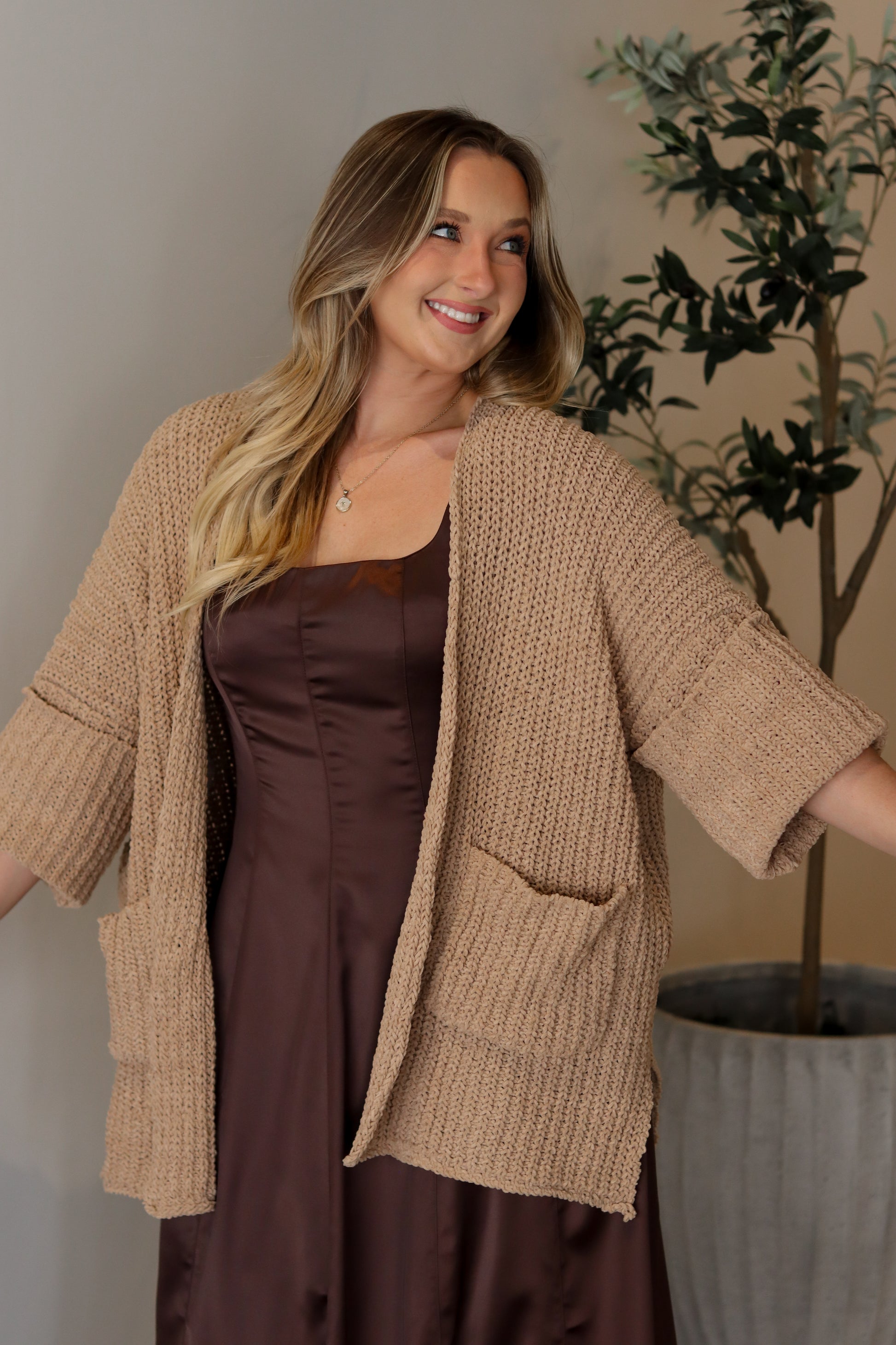 The Ophelia Cardigan is the effortless layer your fall wardrobe has been waiting for. In a rich cocoa brown with an oversized fit and quarter-length sleeves, it drapes beautifully for a cozy yet polished look. Perfect for Thanksgiving gatherings or crisp autumn days, this cardigan adds warm, seasonal charm to any outfit—just throw it on over your favorite basics for an instantly comfy, fall-ready style.