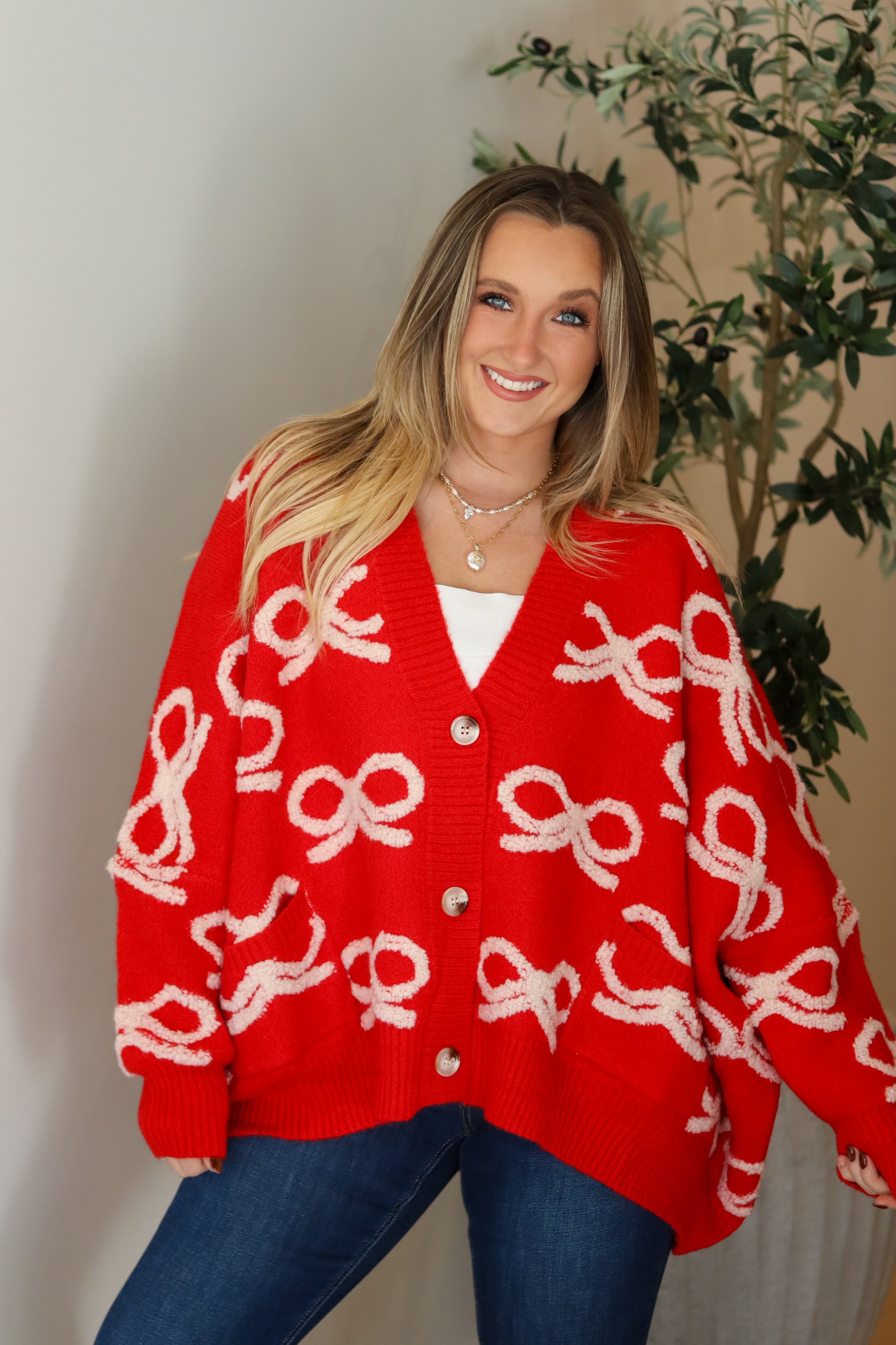 Wrap yourself in festive sweetness with the Peppermint Ribbon Cardigan. This oversized red knit features a candy-cane inspired bow design that brings playful holiday charm to any outfit. Cozy, bold, and perfectly merry, it’s the ideal layer for tree decorating, holiday shopping, or curling up with cocoa. A true Christmas statement piece—soft, sweet, and full of seasonal cheer.
