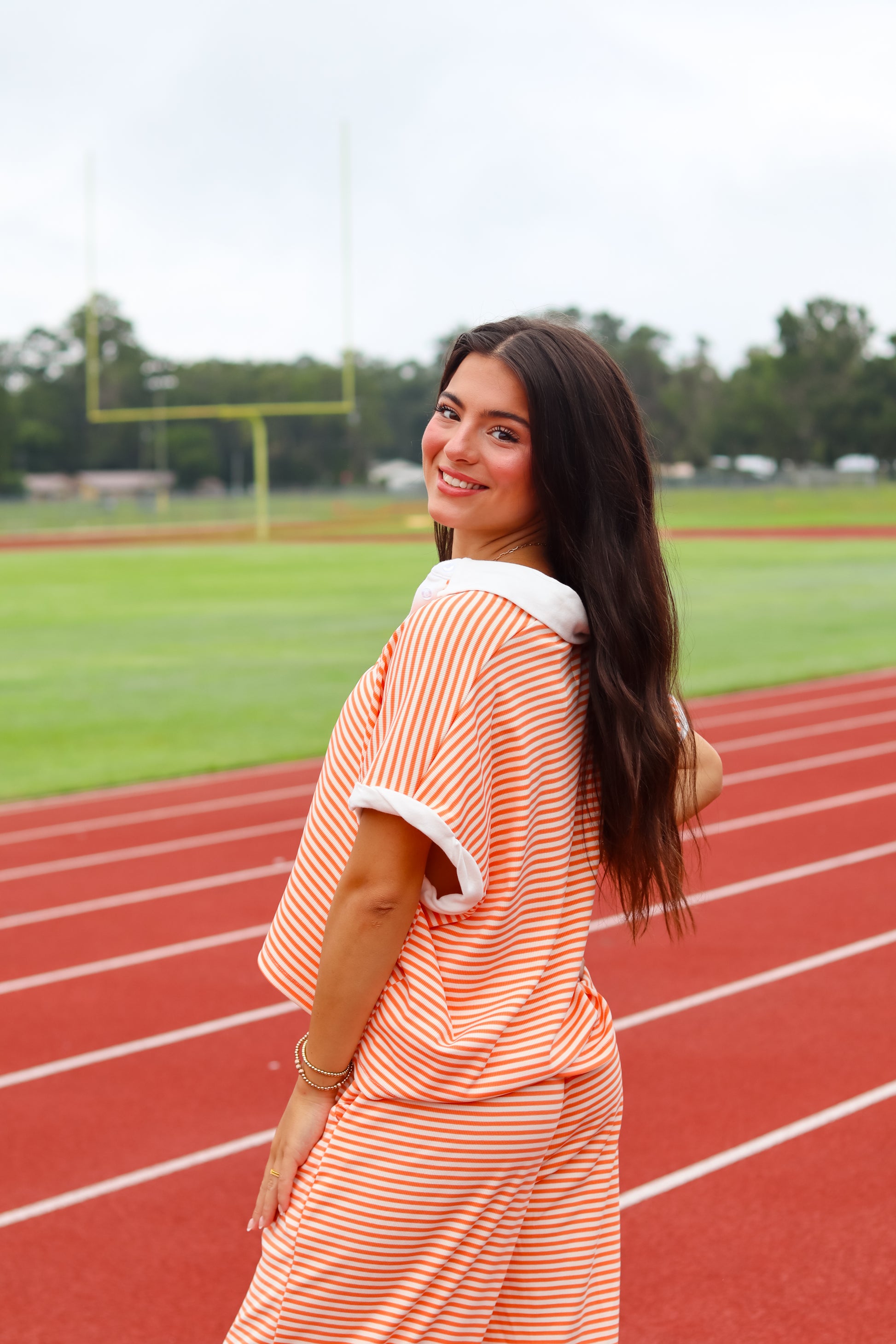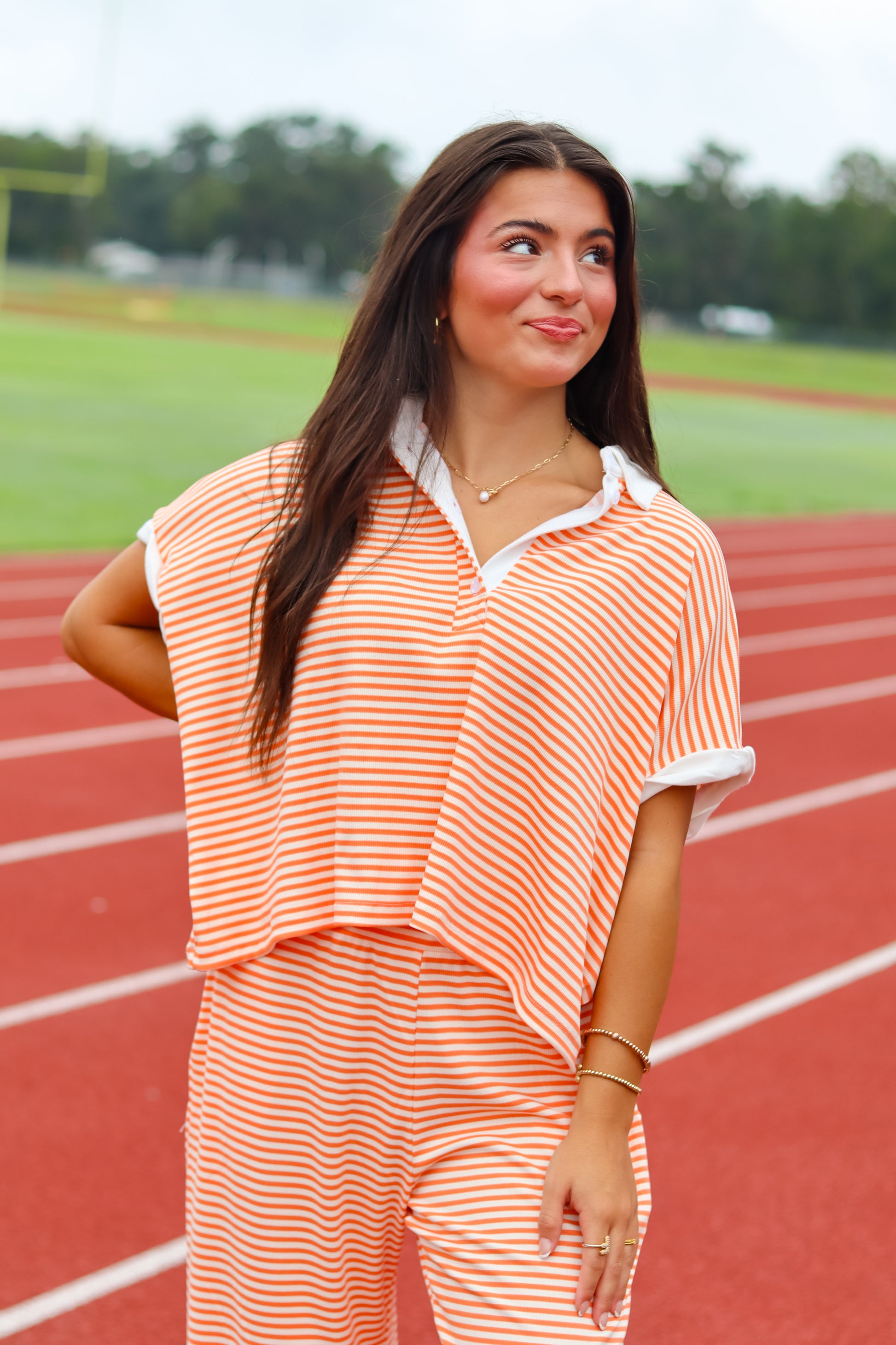 The Milla Collared Stripe Top features bold orange and ivory stripes with a classic collared design. Pair it with the matching Mila Wide Leg Pants for a coordinated set that’s effortlessly chic!