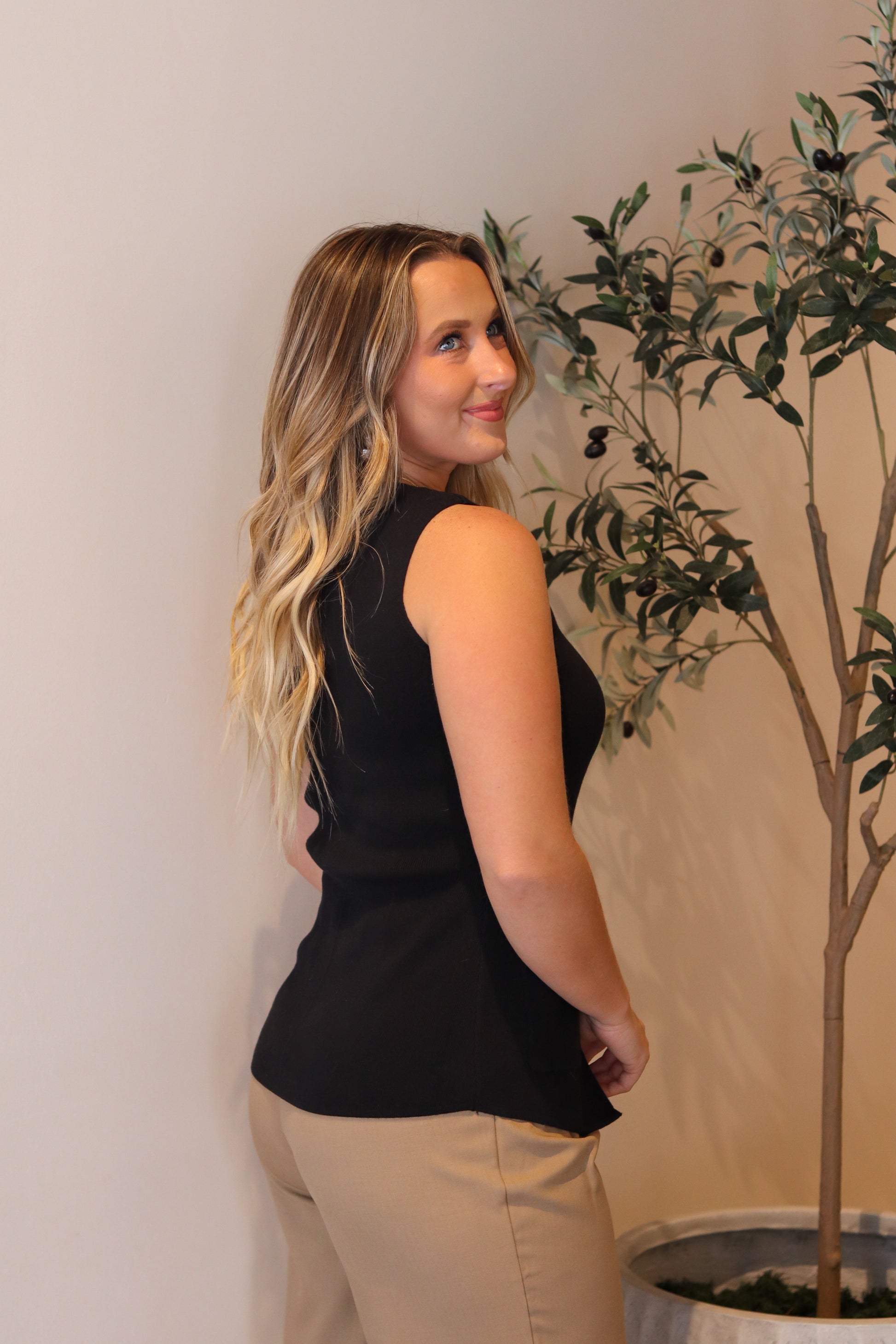 The Regan Knit Vest is a stylish twist on a classic layering piece. In a dark black hue, this tank-style vest features a button-up front with a flattering V-style opening from the last button, creating a subtle hourglass silhouette. Perfect on its own or layered over your favorite tee, the Regan adds effortless charm to any outfit.