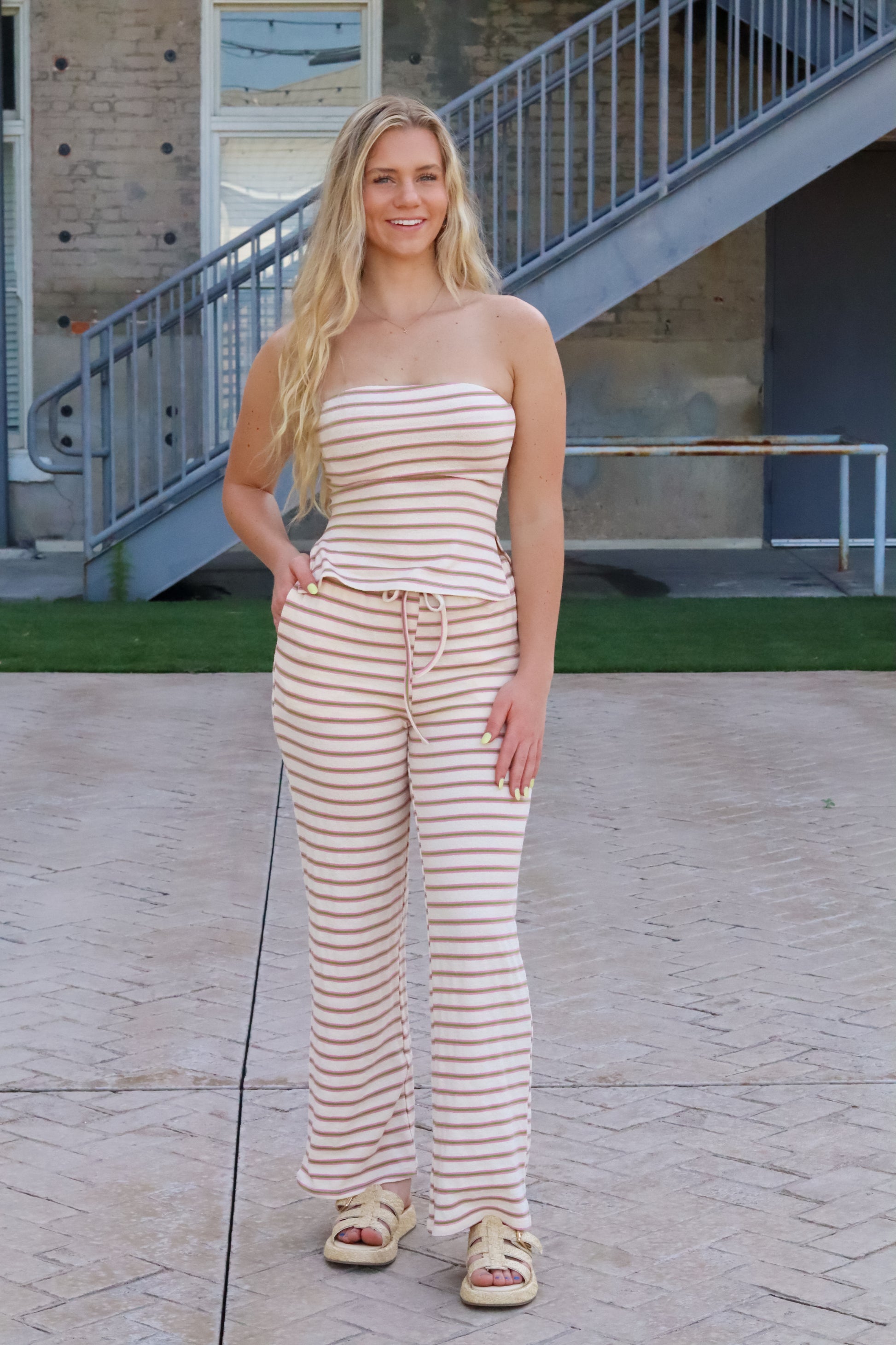 The Shaylee Strapless Set combines effortless style and comfort with cream and pink stripes. Featuring a chic strapless top and tie-waist pants, this set is perfect for warm days when you want to look polished but feel relaxed.