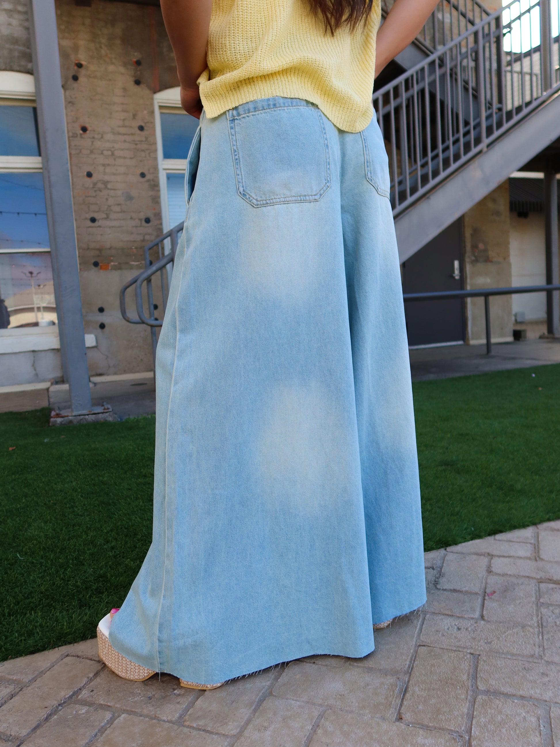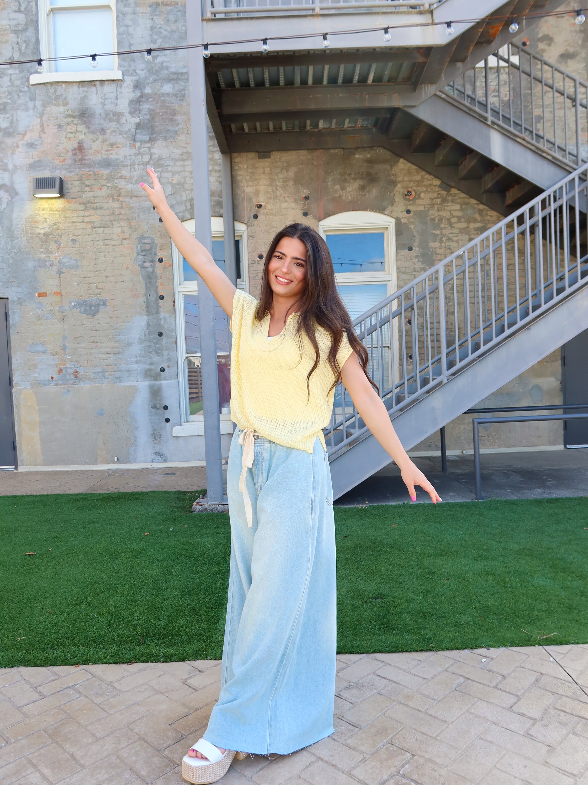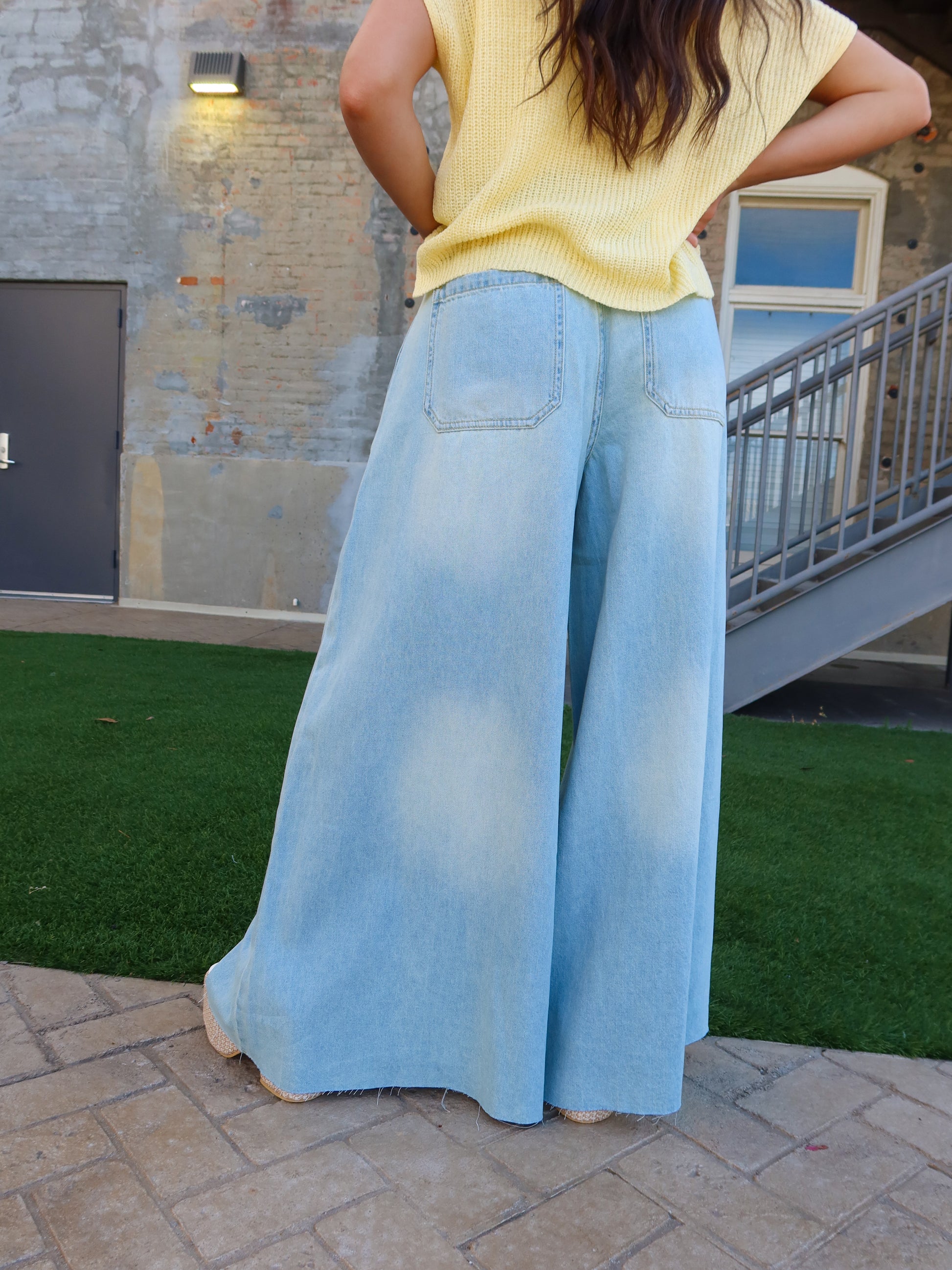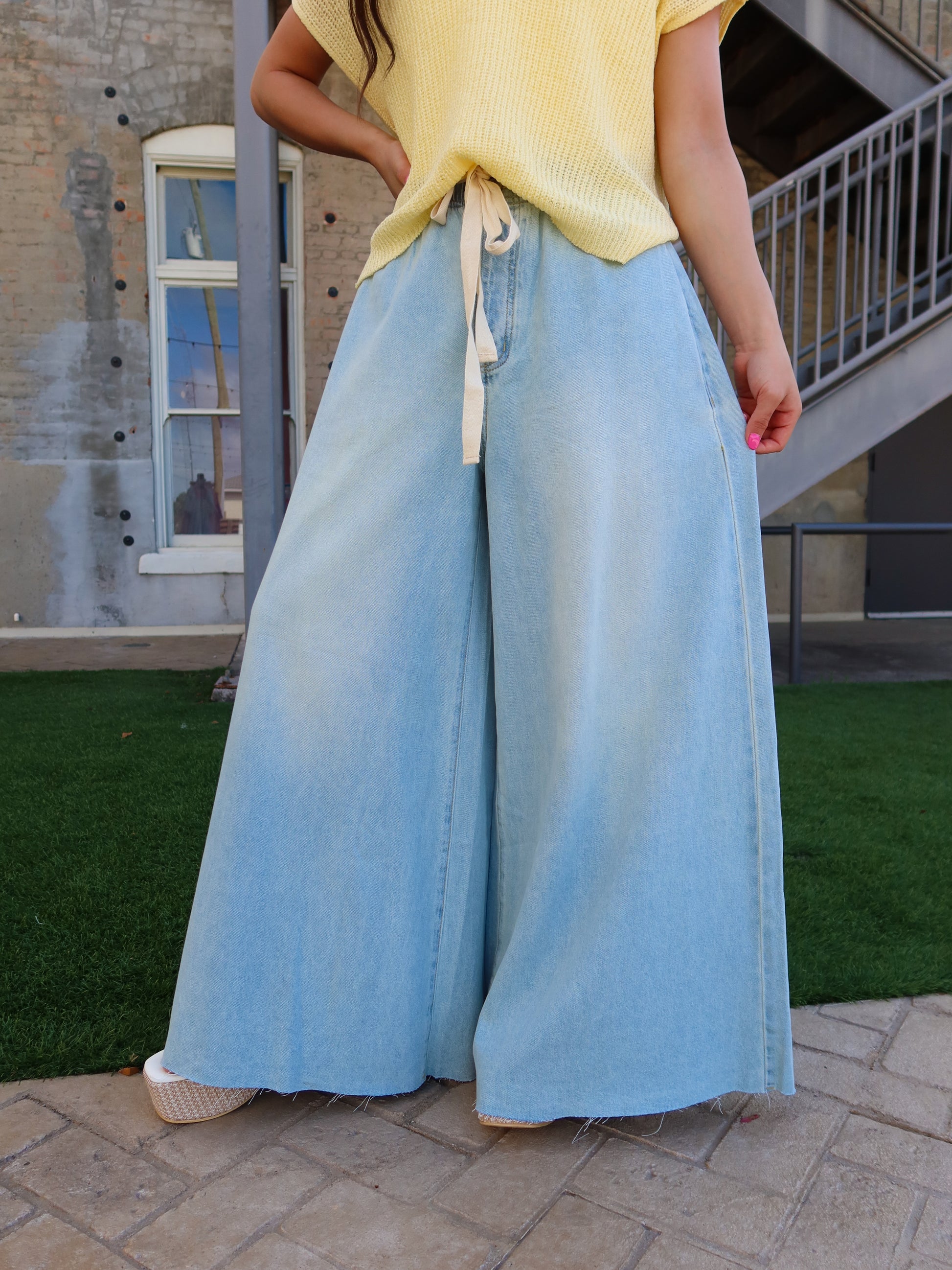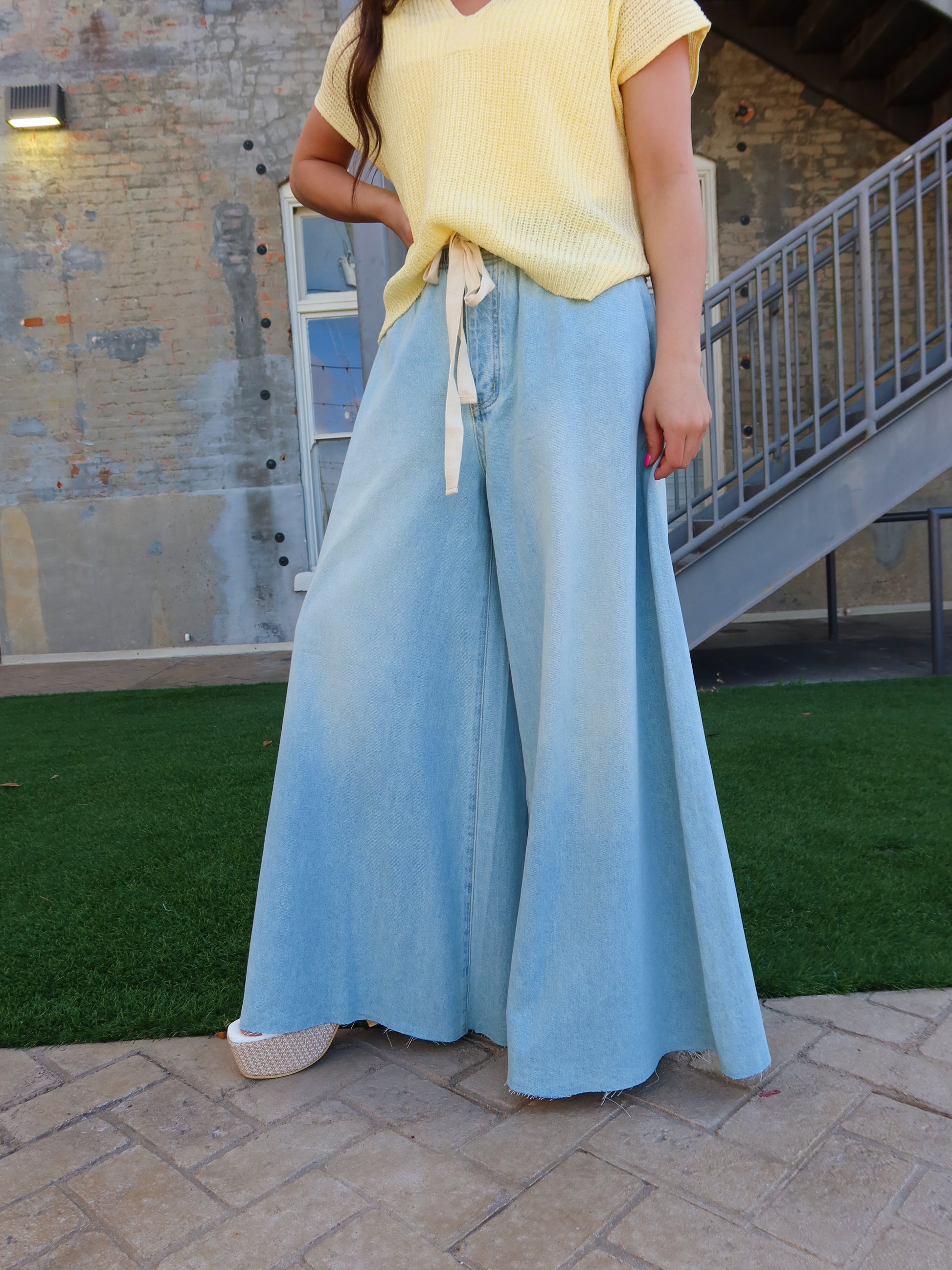 The Sunday Morning Jeans bring an effortless, laid-back feel to your spring wardrobe. Designed with an ultra wide-leg silhouette, a flattering tie waist, and a relaxed raw hem, they blend comfort with easy style. Lightweight and flowy with just the right amount of structure, they’re perfect for pairing with your favorite knits, blouses, and sunny spring days.