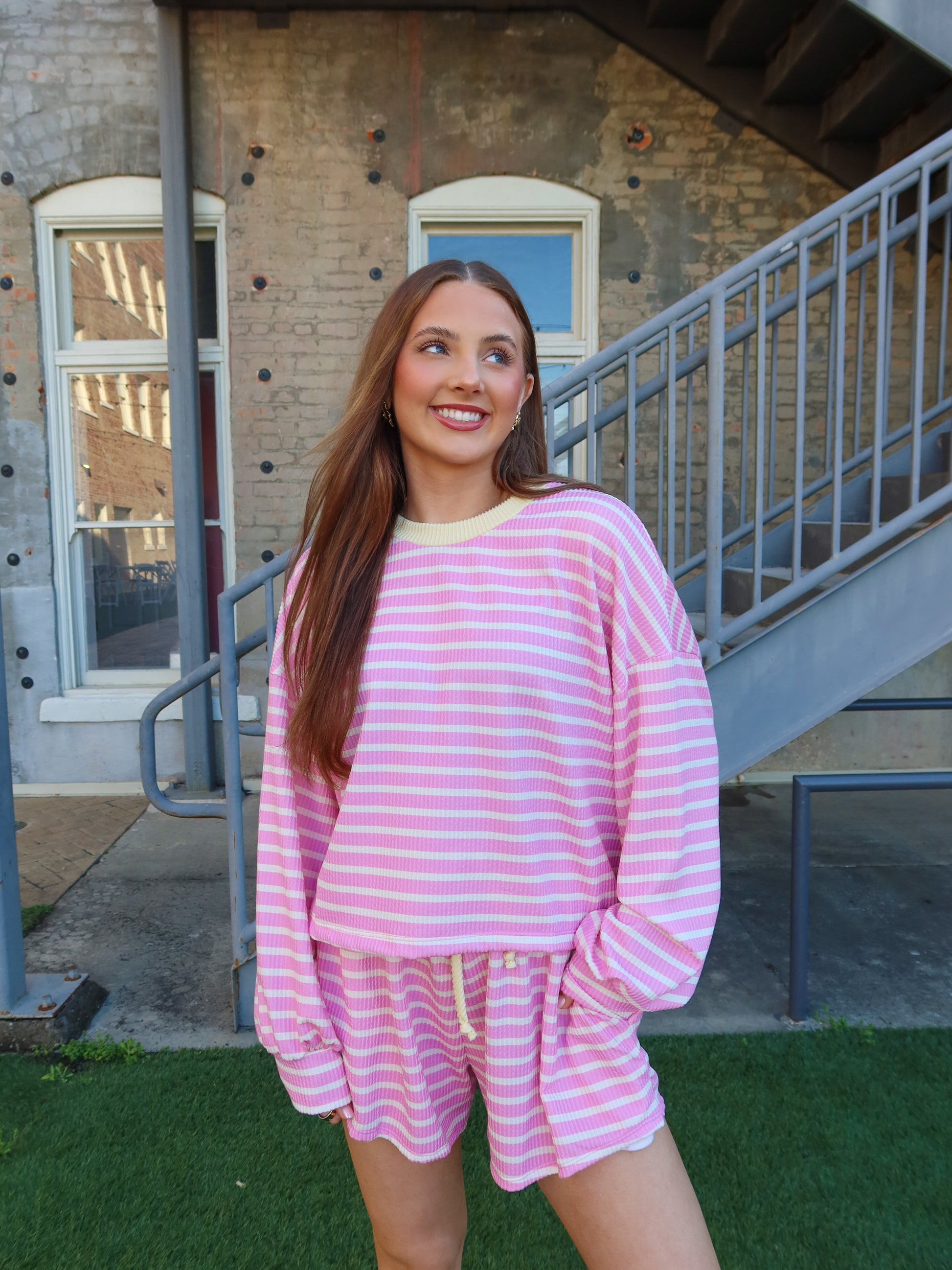 The Tatum Striped Short Set is made for sunshine and carefree Spring Break days. Featuring playful pink and yellow stripes, this lightweight set pairs a relaxed long sleeve top with matching shorts for the perfect balance of cozy and breezy. Whether you're strolling along the beach, grabbing coffee after a morning walk, or lounging with friends, the Tatum set brings an effortless pop of color to every sunny moment.