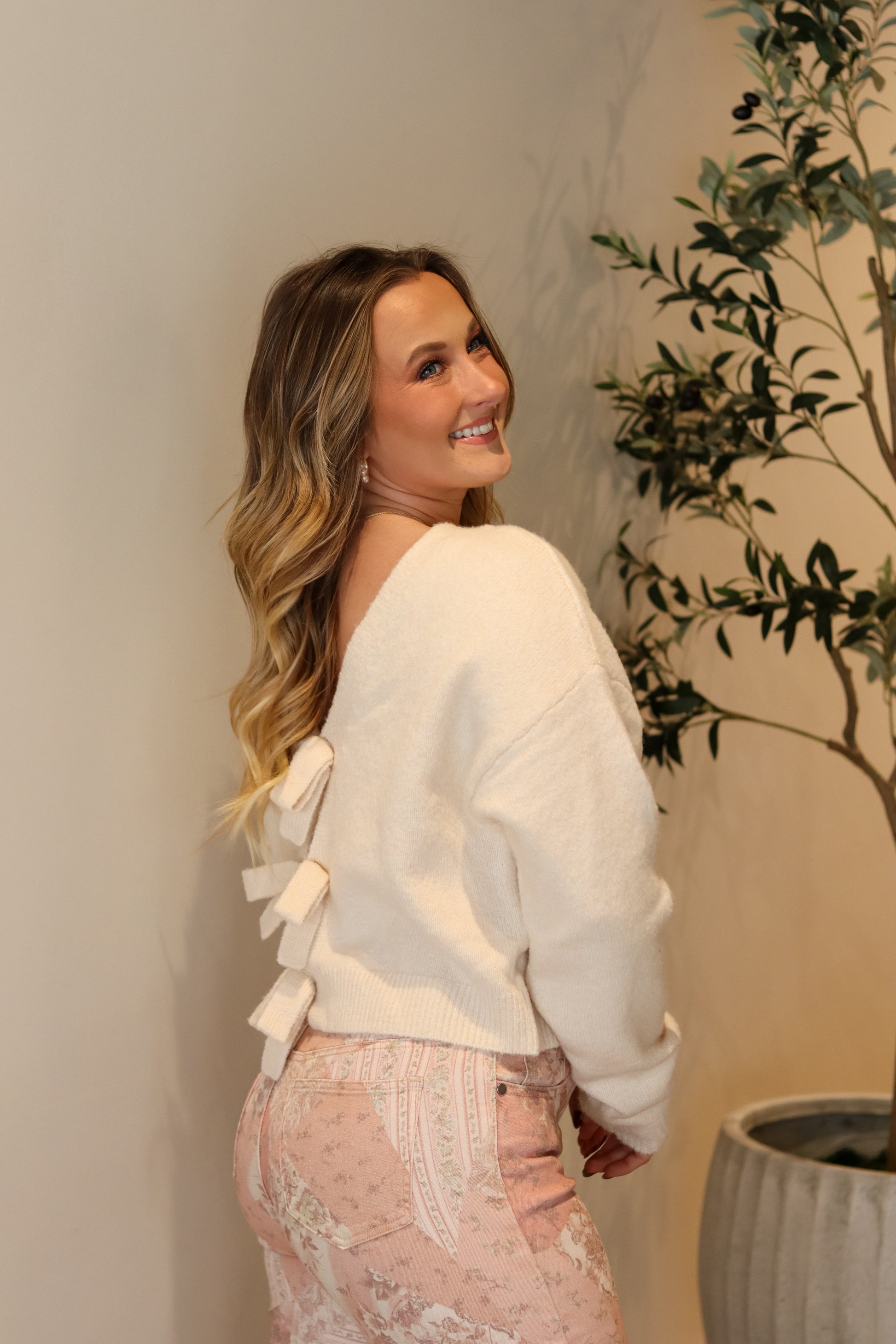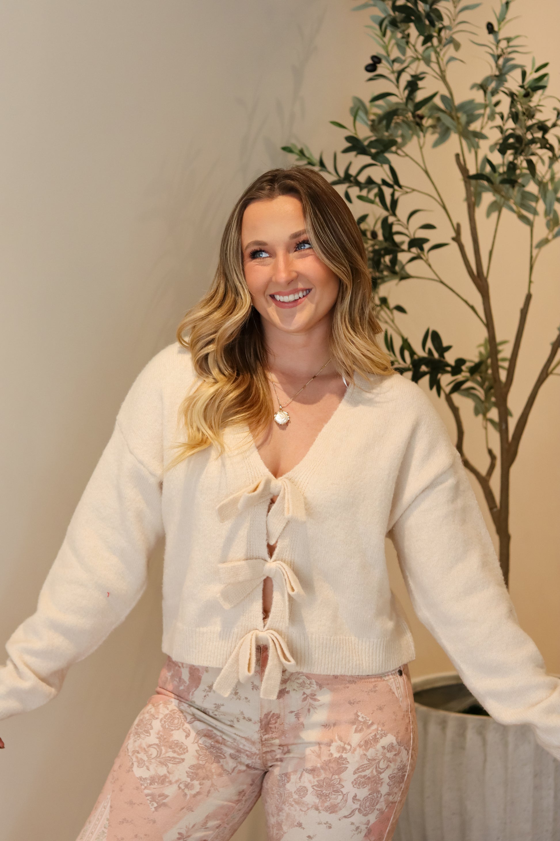 Delicate winter charm meets cozy comfort in the Tied Together Bow Knit Top. This cream, V-neck knit features dainty bow-tie details along the front, giving it a soft, snow-kissed elegance perfect for the season. Warm enough for chilly days yet feminine enough for holiday outings, it’s the ideal piece for adding a touch of wintry sweetness to your wardrobe.