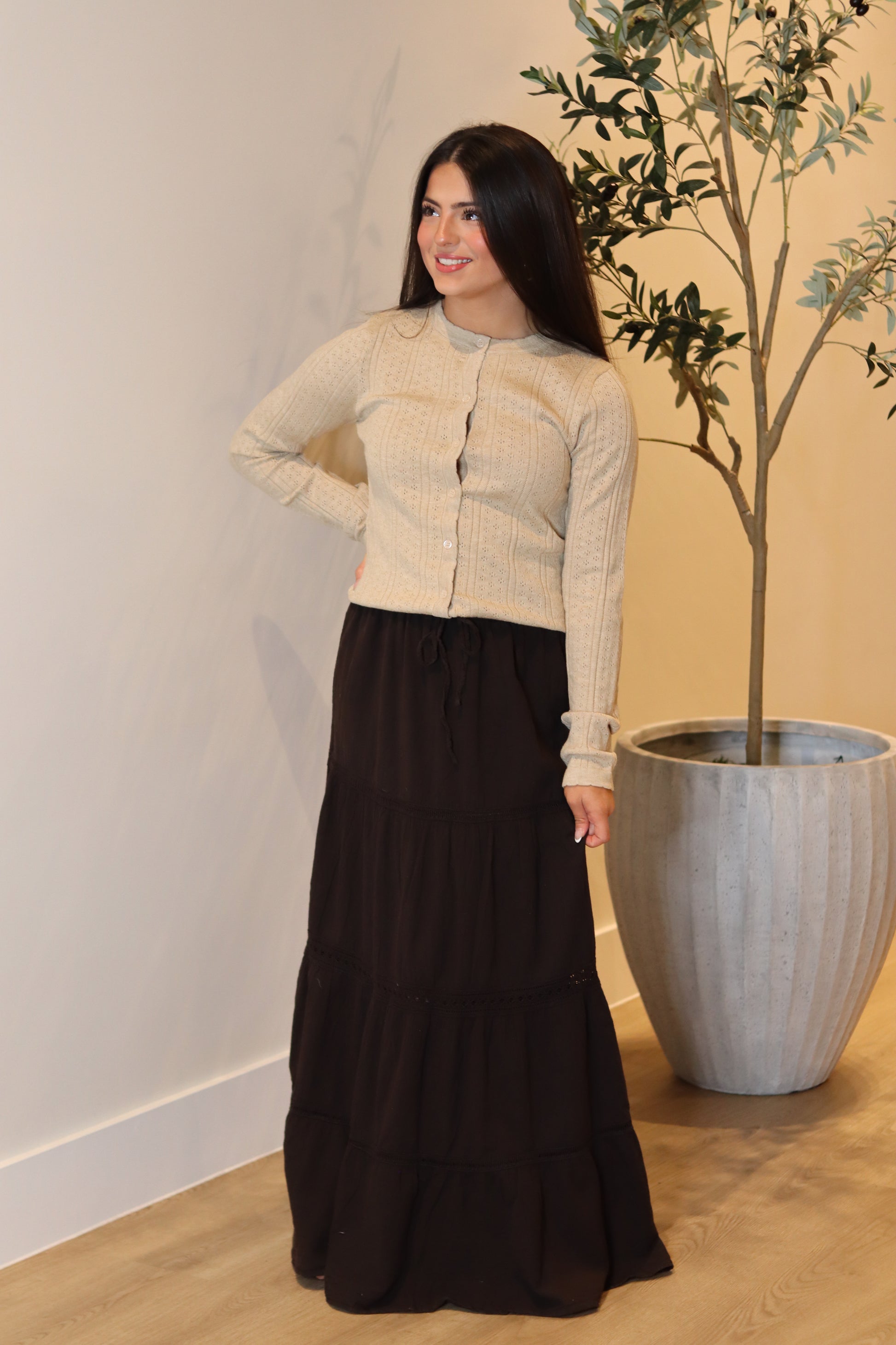 The Verona Crochet Maxi Skirt brings cozy elegance in a rich espresso hue. Featuring a soft crochet knit and an easy, flowy silhouette, it’s perfect for layering through the seasons or styling for a relaxed, elevated look. Comfortable, timeless, and effortlessly chic.